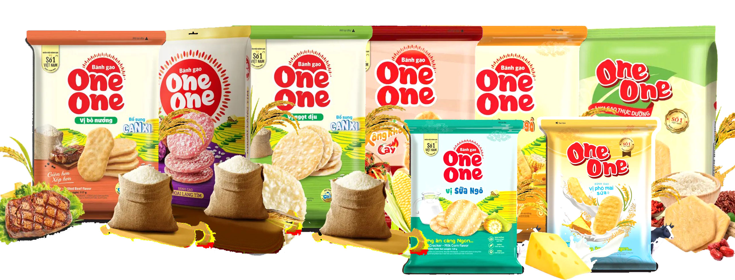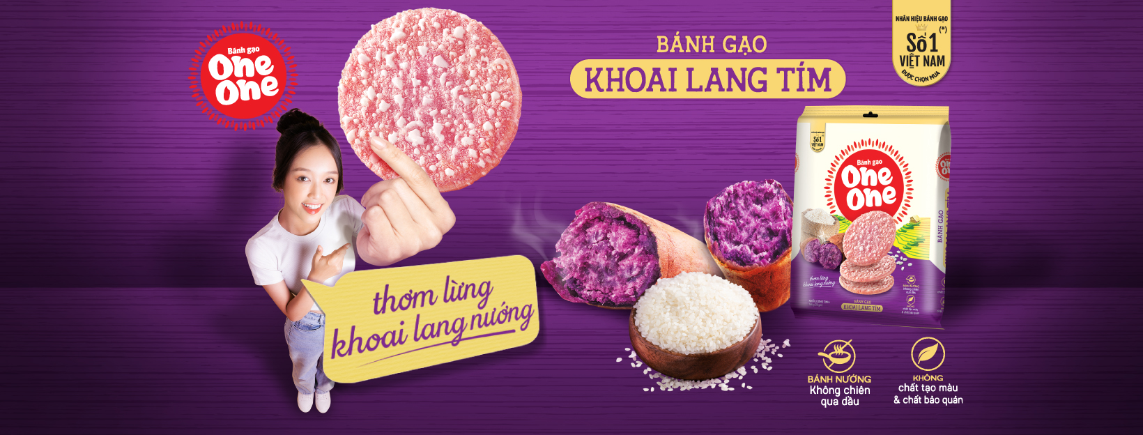 • Thơm lừng khoai lang nướng: Từ nguồn nguyên liệu tự nhiên thuần Việt kết hợp với công nghệ nướng bánh hiện đại, One One cho ra đời dòng bánh gạo khoai lang tím thơm lừng, giòn rụm, ngon khó cưỡng: Gạo Japonica trắng thơm, vừa ngon vừa lành, giàu dưỡng chất như vitamin B1, B2, E. Khoai lang tím ngọt bùi tự nhiên, giàu chất chống Oxy hoá, có tác dụng tăng sức đề kháng cho cơ thể, là món ăn bổ dưỡng cho cả nhà.