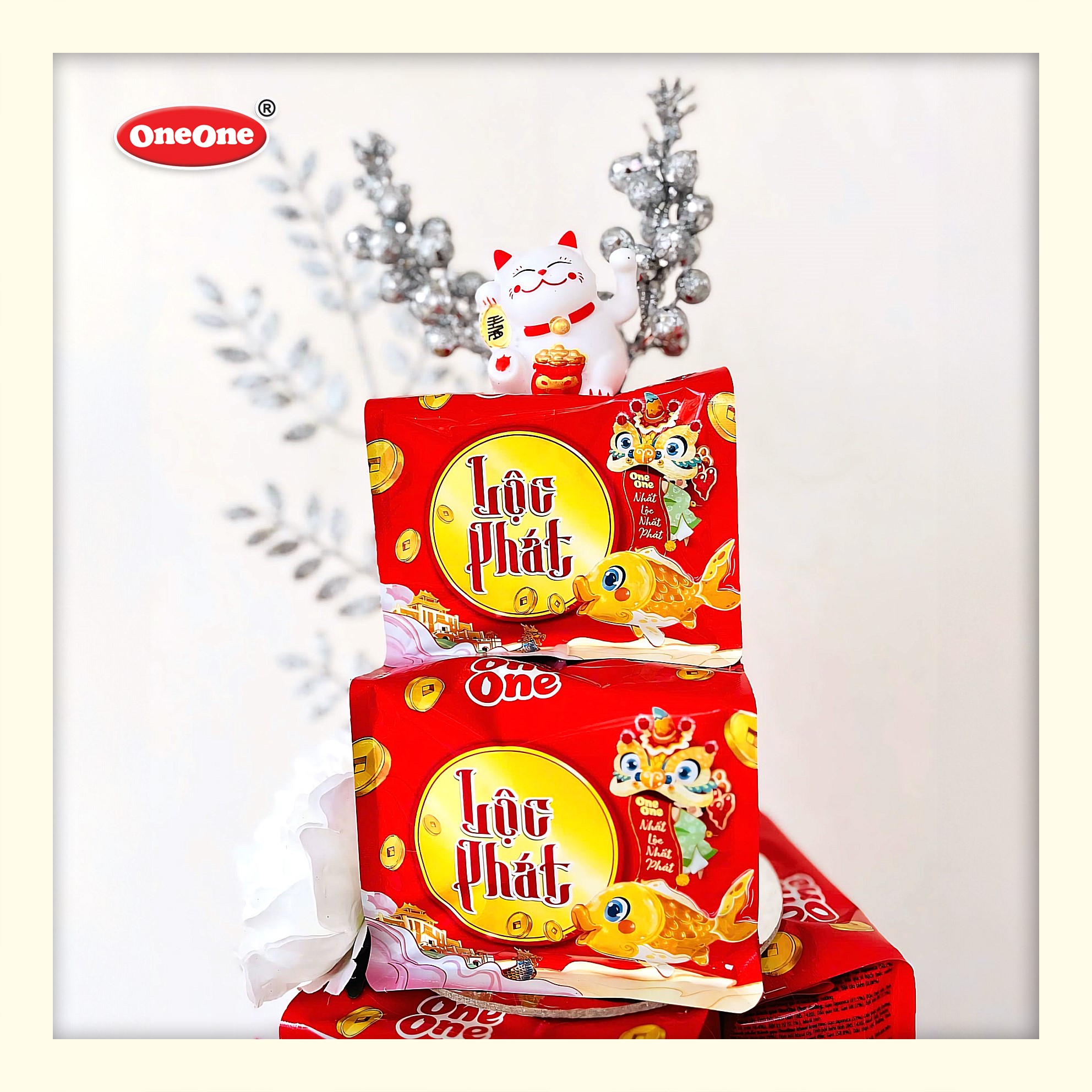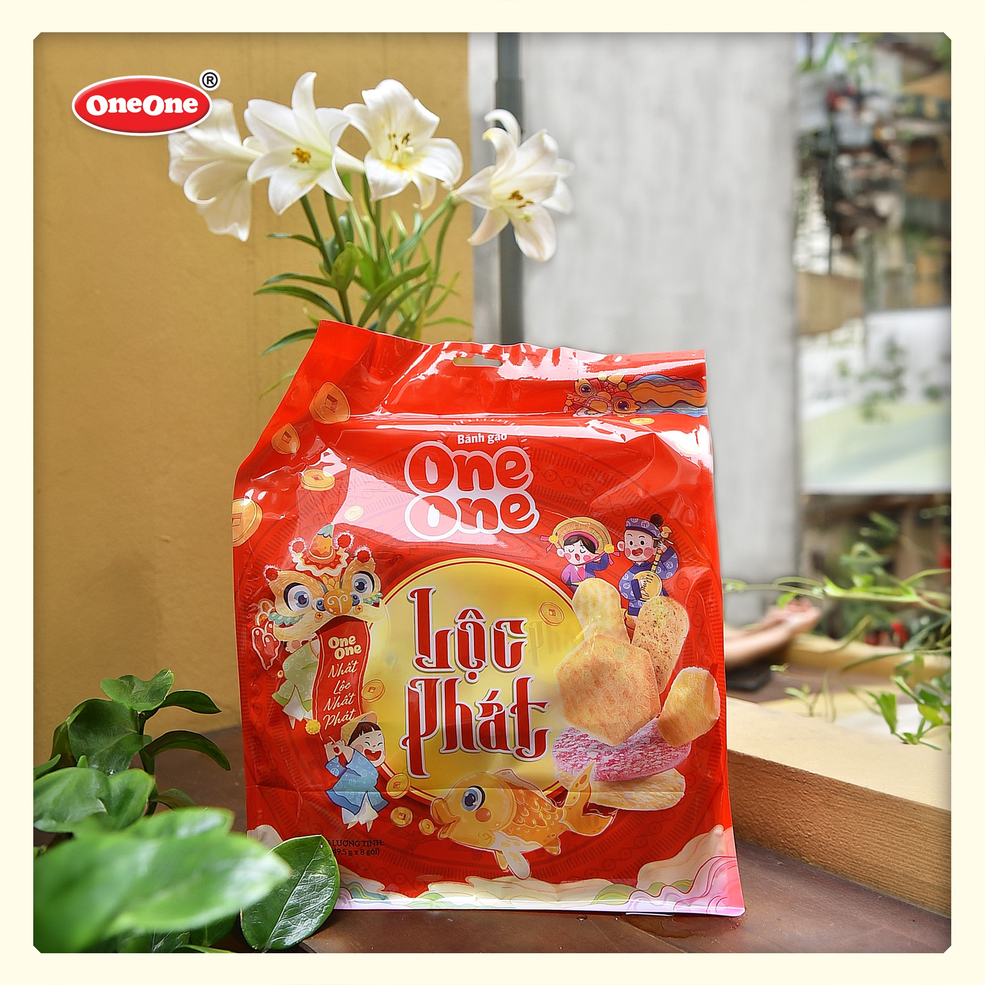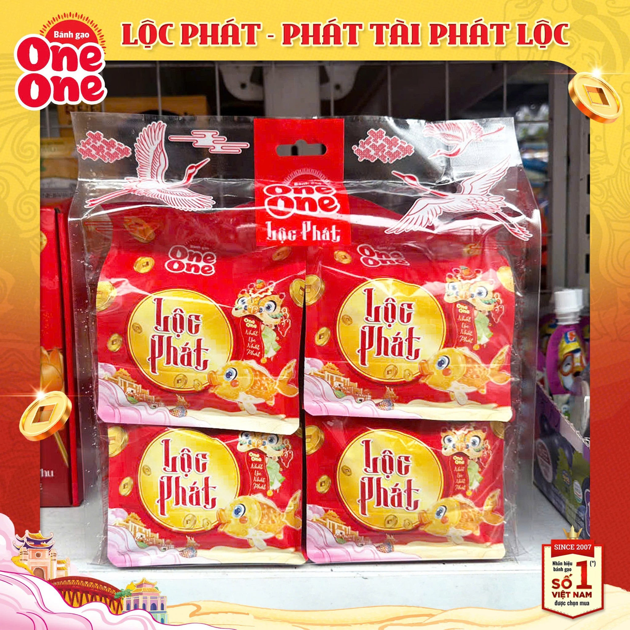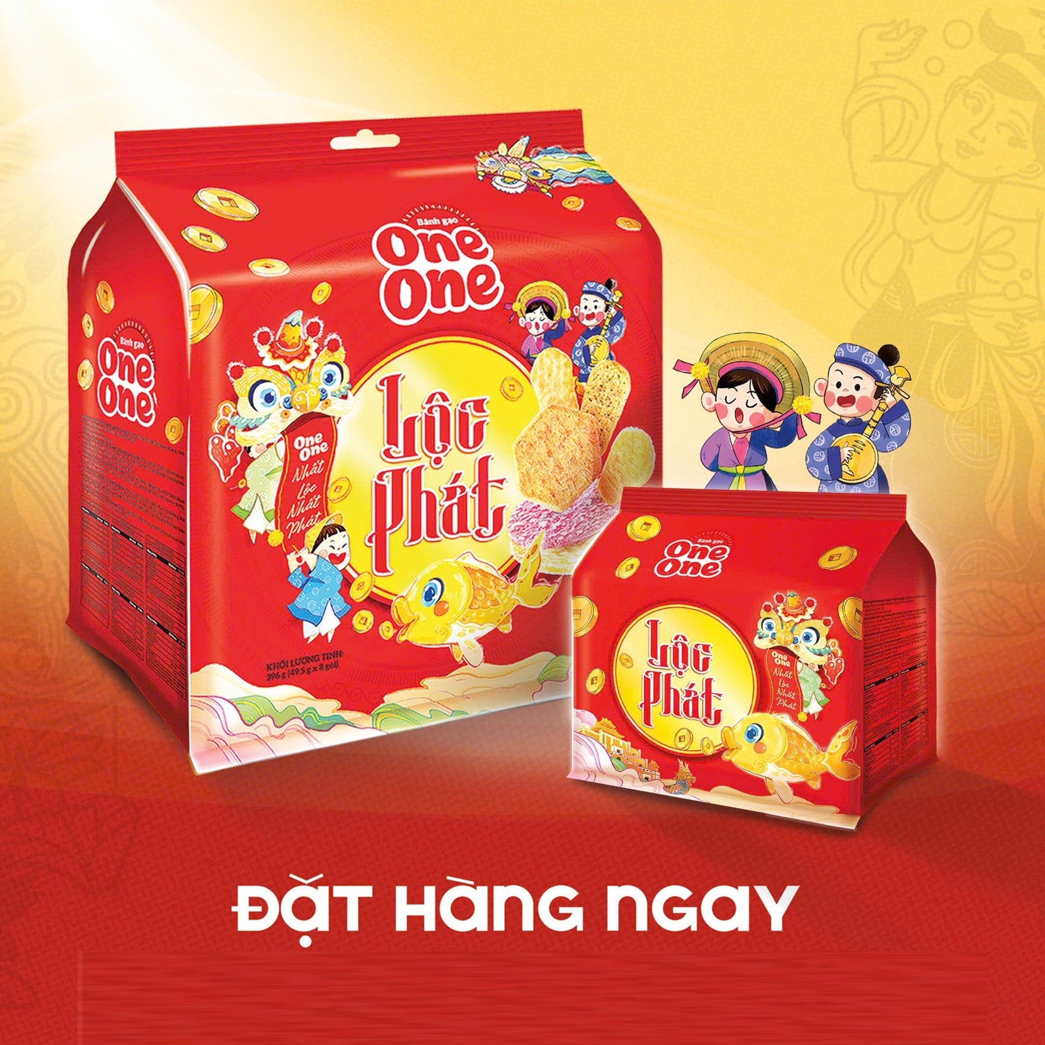 • Bánh gạo One One Lộc Phát với màu đỏ vàng đặc trưng – tượng trưng cho may mắn, thịnh vượng, được sử dụng để xếp tháp đi lễ chùa cầu may, thờ cúng tổ tiên, biếu tặng.