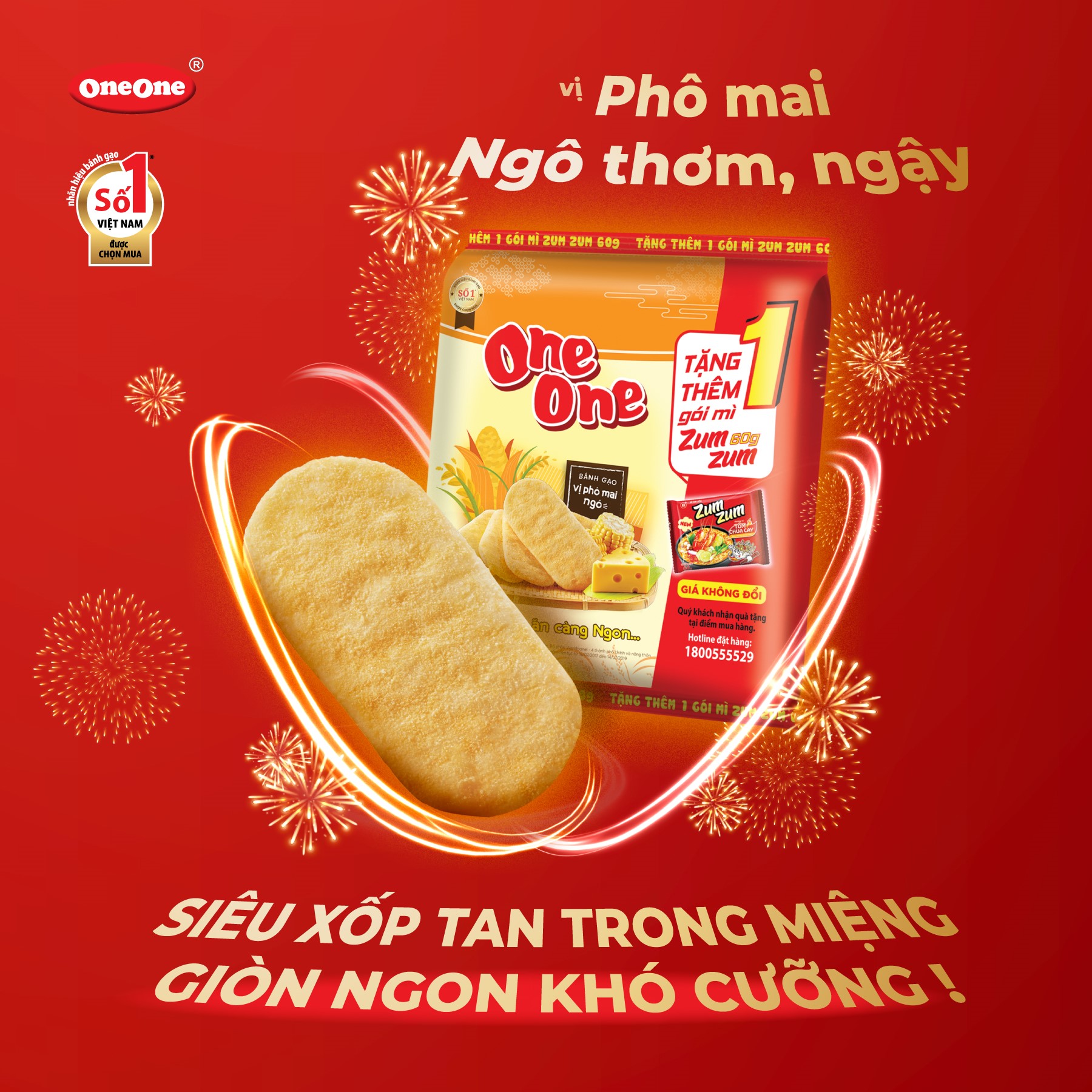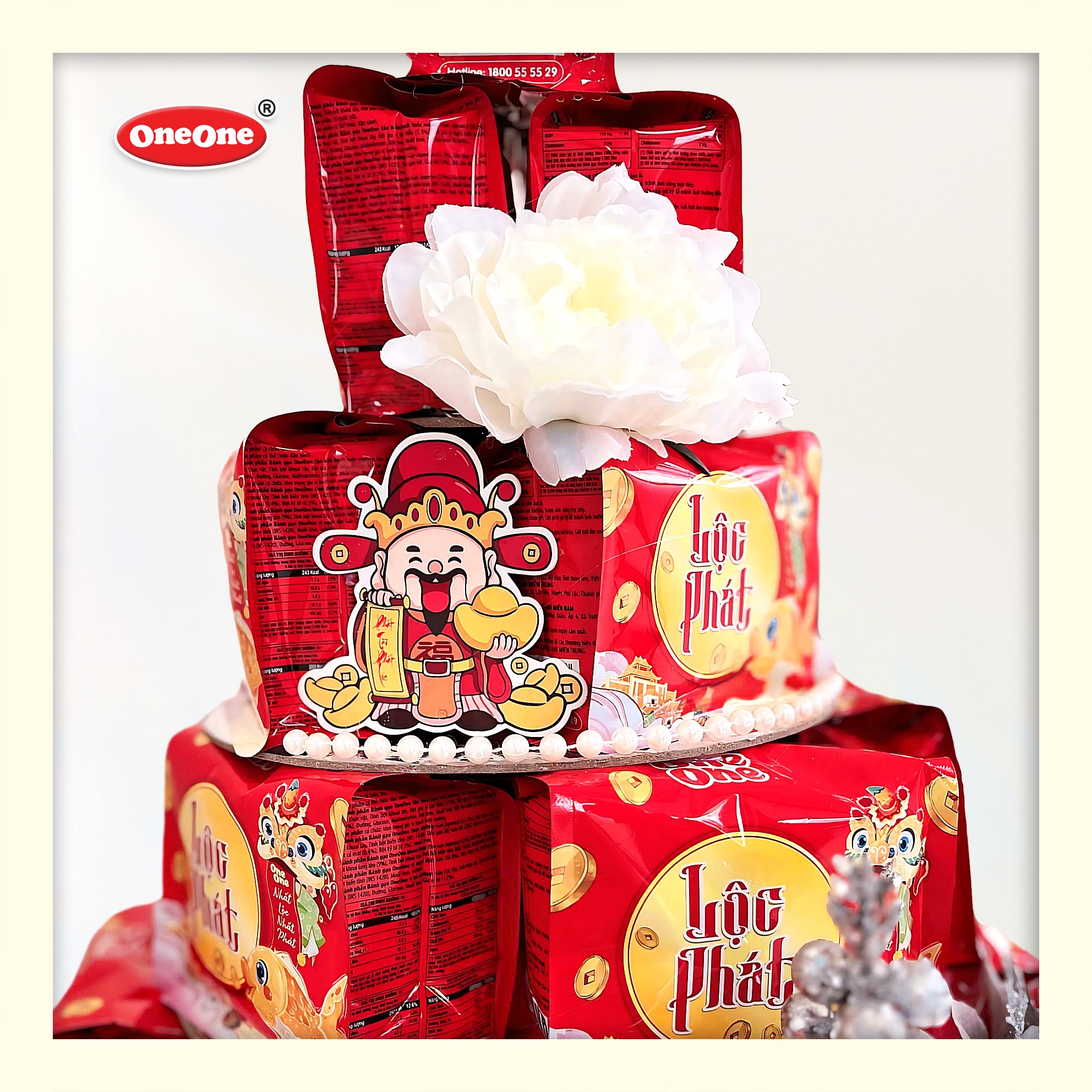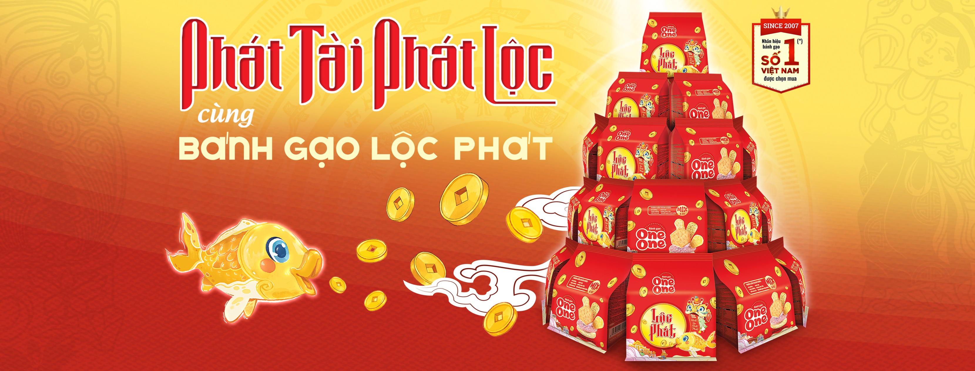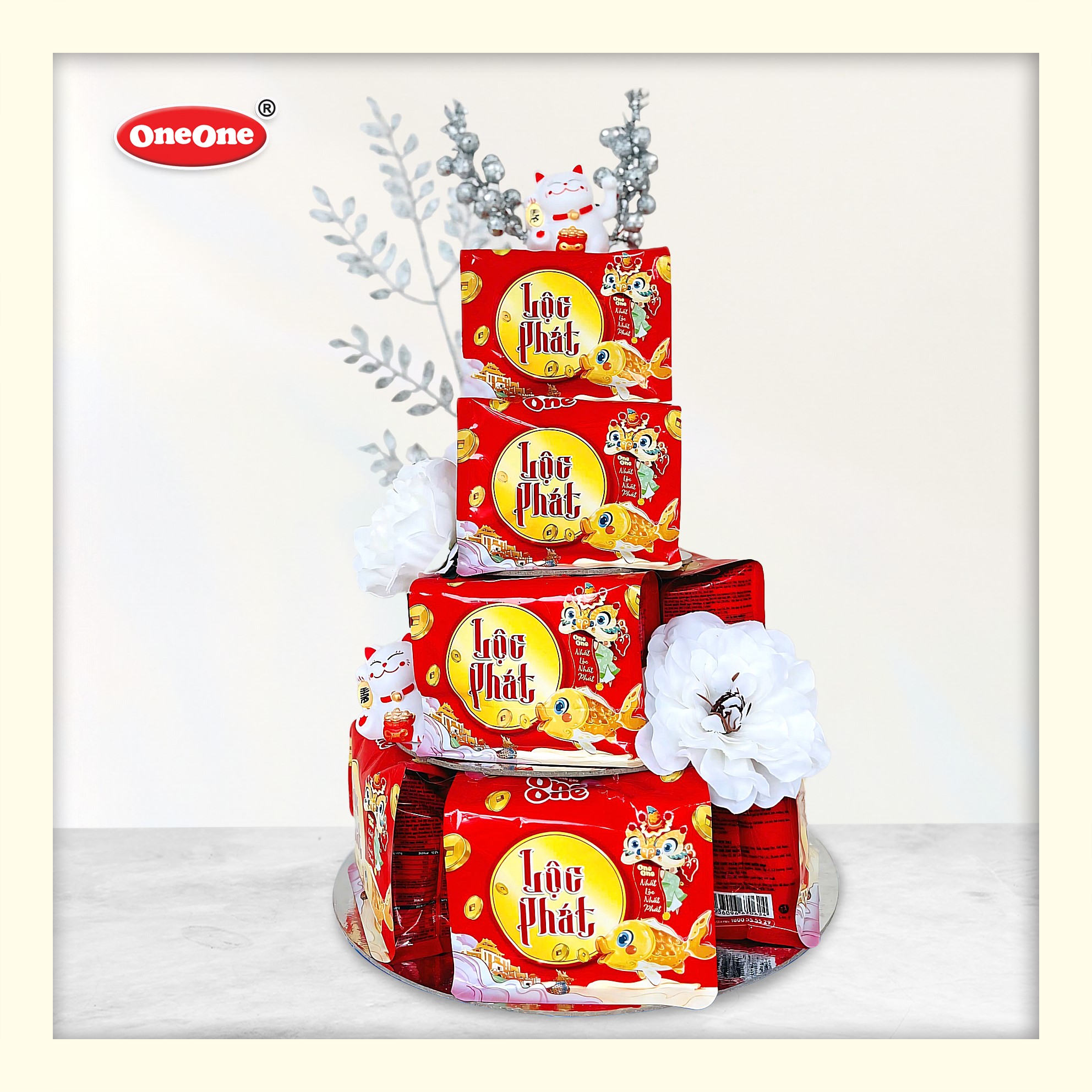 • Bánh gạo One One Lộc Phát với màu đỏ vàng đặc trưng – tượng trưng cho may mắn, thịnh vượng, được sử dụng để xếp tháp đi lễ chùa cầu may, thờ cúng tổ tiên, biếu tặng.