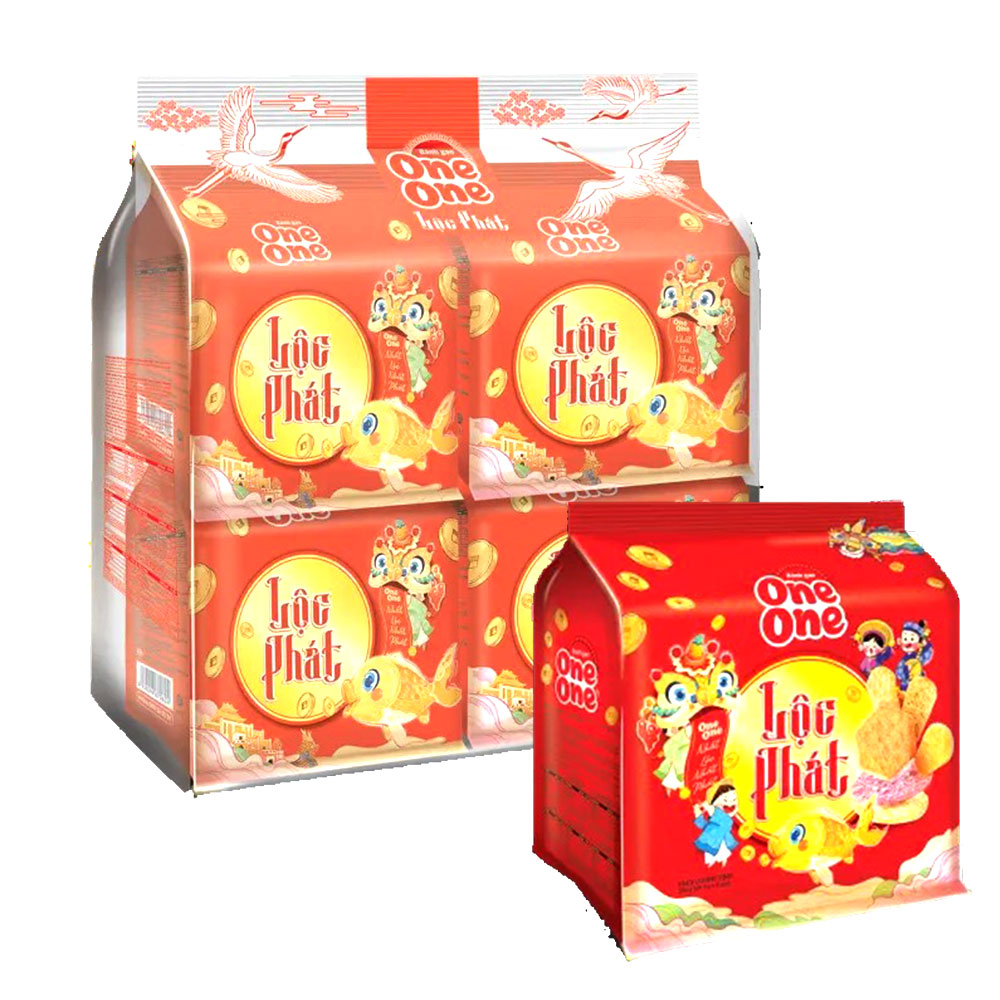 Lấy cảm hứng từ nét đẹp văn hoá của người Việt, Bánh gạo One One Lộc Phát (6 vị - 8 gói) ra đời không chỉ là những chiếc bánh gạo thơm ngon giòn rụm, mà còn mang trong mình những giá trị văn hóa truyền thống dân tộc. Con số 6 tượng trưng cho “Lộc” – sự khởi đầu may mắn, tài lộc sung túc; số 8 là “Phát” – biểu trưng cho thành công, thịnh vượng. Thiết kế túi bánh mang sắc đỏ vàng rực rỡ, thích hợp để thắp hương, biếu tặng, đi lễ chùa hoặc dùng tiện lợi mỗi ngày như bữa sáng, bữa phụ, phù hợp với nhịp sống hiện đại năng động.