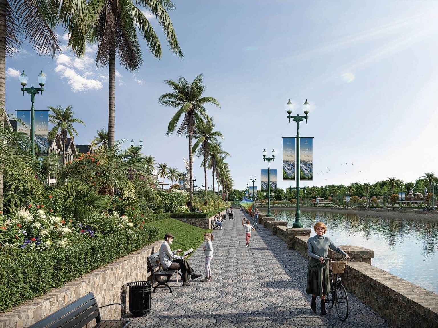 Bến du thuyền, đường dạo bộ ven sông, cầu nối sông, hồ câu cá.