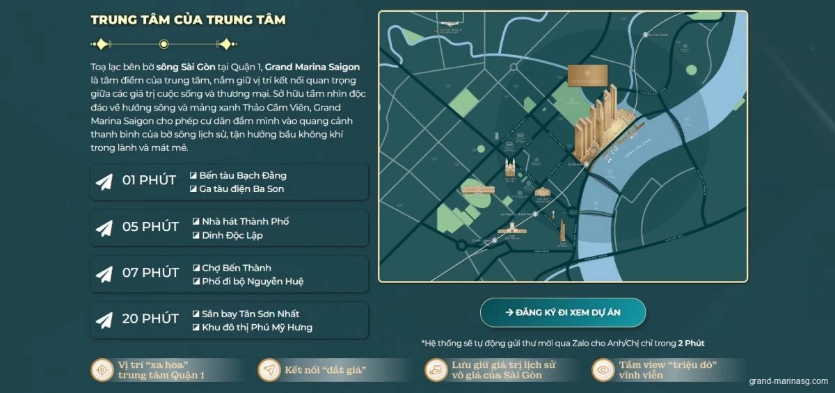 Grand Marina nằm ngay trái tim Quận 1, bên dòng sông Sài Gòn thơ mộng, Grand Marina Saigon là khu căn hộ hàng hiệu lớn nhất thế giới mang thương hiệu Marriott và JW Marriott. Dự án được phát triển bởi Masterise Homes, sở hữu vị trí vàng cùng thiết kế sang trọng, đẳng cấp, hứa hẹn trở thành biểu tượng mới của TP.HCM.