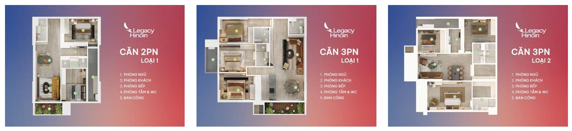 Căn hộ tại dự án Legacy Hinoiri được thiết kế theo chuẩn Nhật Bản, tối ưu không gian sống với các loại diện tích đa dạng: