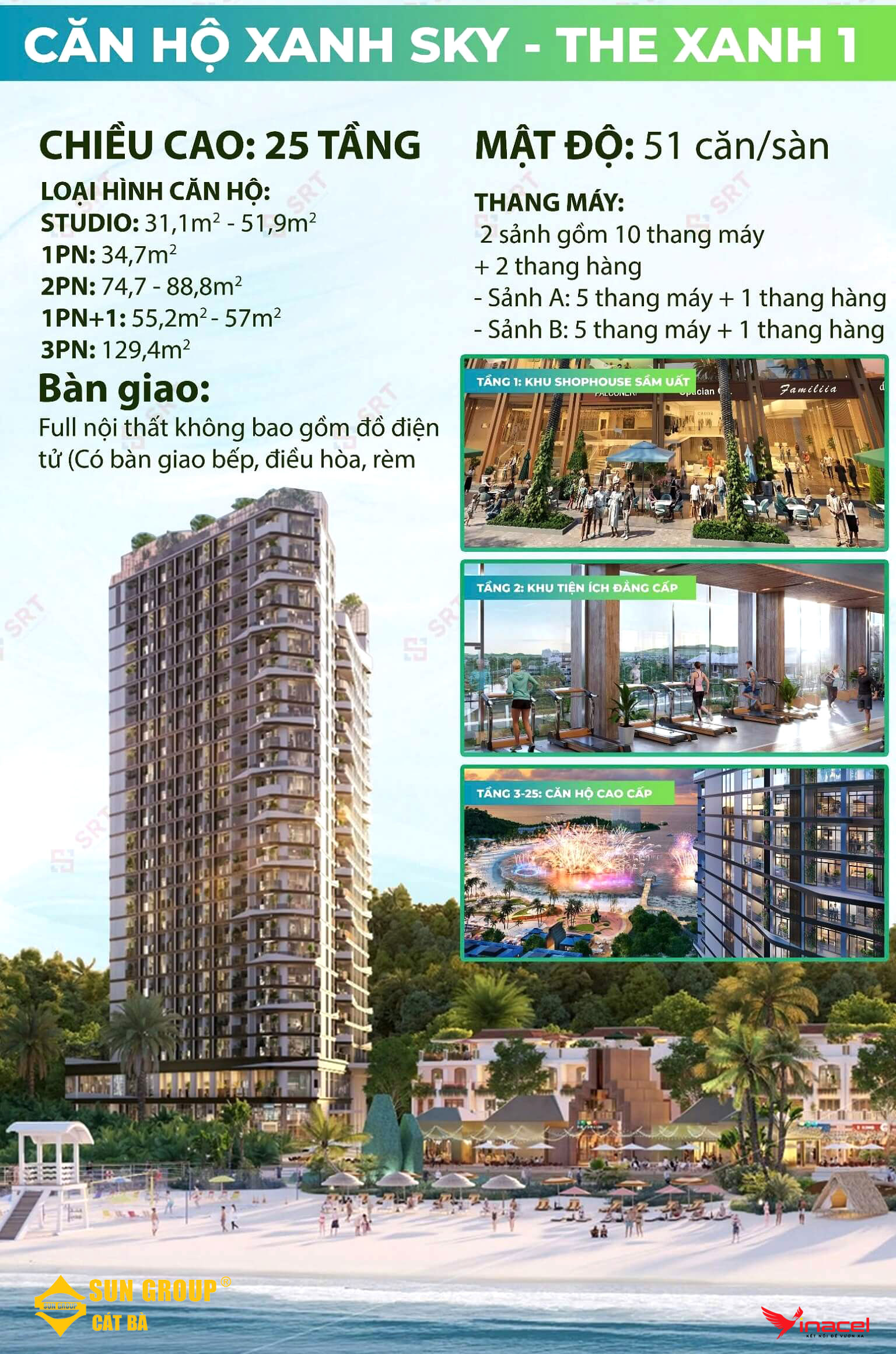 Chung cư Sun Cát Bà còn được gọi là Xanh Sky là công trình biểu tượng của dự án, tựa cánh buồm no gió khổng lồ đang vươn mình ra khơi, biểu trưng cho sức sống mạnh mẽ và sự thịnh vượng. Chung cư Sun Cát Bà được bao phủ bởi những mảng kính lớn phản chiếu ánh sáng mặt trời, tòa tháp được ví như một viên kim cương xa hoa, biểu trưng cho sự vươn cao của Cát Bà. Với chiều cao nổi bật trên khối đế rộng, tòa căn hộ Sun Cát Bà tựa như ngọn hải đăng dẫn đường cho cư dân tương lai và du khách đến đây.