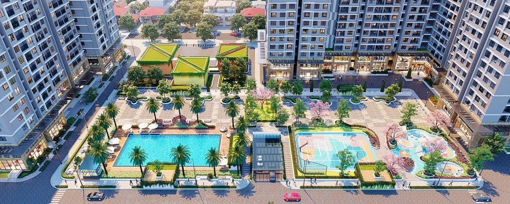 Tiện ích nội khu: Bể bơi, công viên cây xanh, vườn dạo bộ, trường mầm non, khu vui chơi trẻ em, TTTM, Gym-Spa…