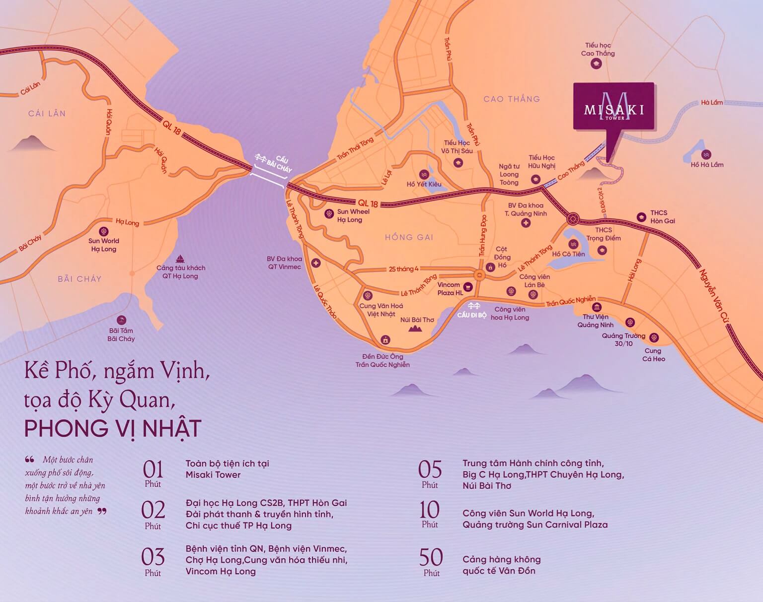 Nằm trên trục đường huyết mạch Nguyễn Văn Cừ, ngay trung tâm Hạ Long, Misaki Tower sở hữu vị trí đắc địa với tầm nhìn rộng mở, kết nối nhanh chóng đến hệ thống tiện ích cao cấp như trường học, bệnh viện, trung tâm hành chính và khu vui chơi giải trí với vài phút di chuyển. Nhờ tọa lạc trên đồi nhìn thẳng ra Vịnh Hạ Long với mật độ dân cư hợp lý, cư dân tương lai tại Misaki Tower cũng sẽ được tận hưởng không gian sống thoáng đãng, vừa gần phố thị sầm uất, vừa dễ dàng chạm đến hơi thở biển khơi.