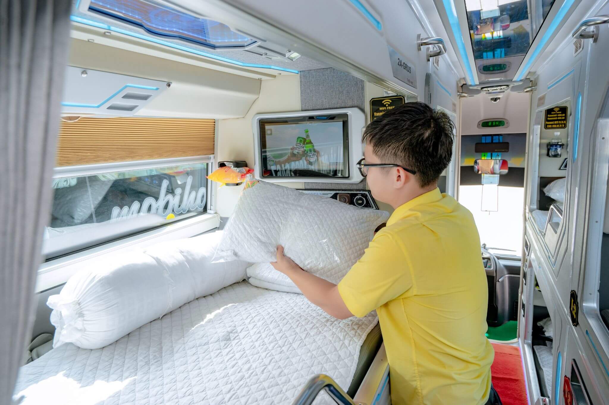Đảm bảo vệ sinh an toàn: Chăn gối được giặt sạch và bọc ni lông sau mỗi chuyến đi, mang đến sự yên tâm tuyệt đối cho quý khách.