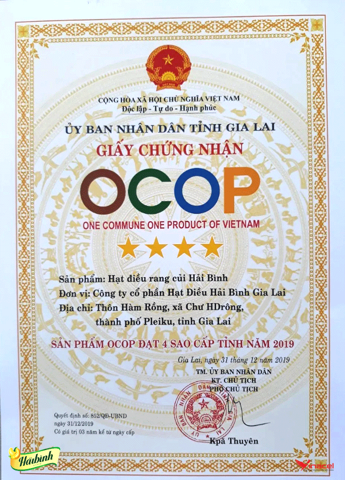 • Đạt chứng nhận “Sản phẩm OCOP đạt 4 sao cấp Tỉnh năm 2019” do UBND tỉnh Gia Lai trao tặng.