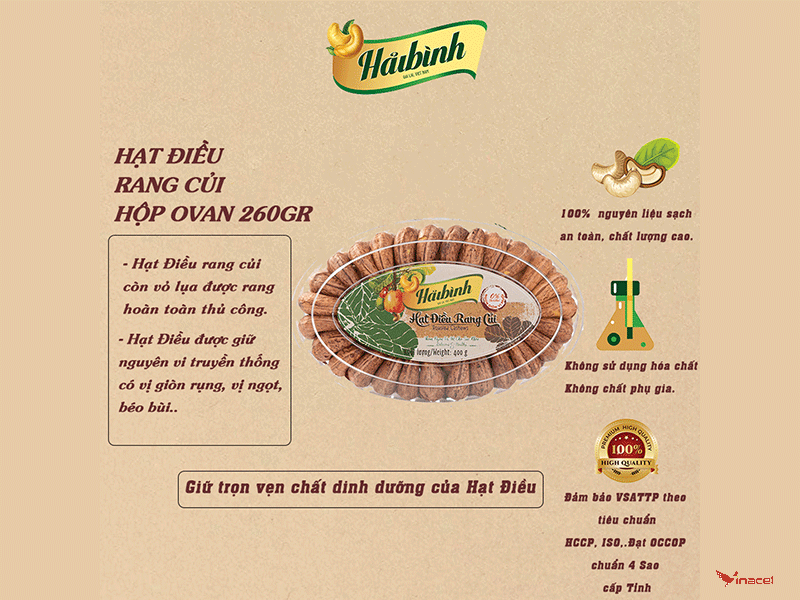• Hạt điều rang củi có vỏ lụa được sản xuất và chọn lọc kĩ lưỡng để cho ra hạt điều to tròn, chắc hạt. Hạt điều rang muối có vỏ lụa có vị giòn rụm, có vị ngọt, béo bùi… và chất lượng vẫn mang mùi vị đặc trưng của Hạt điều rang củi Hải Bình. Sản phẩm rang hoàn toàn bằng phương pháp thủ công bằng củi điều từ những người công nhân lành nghề.