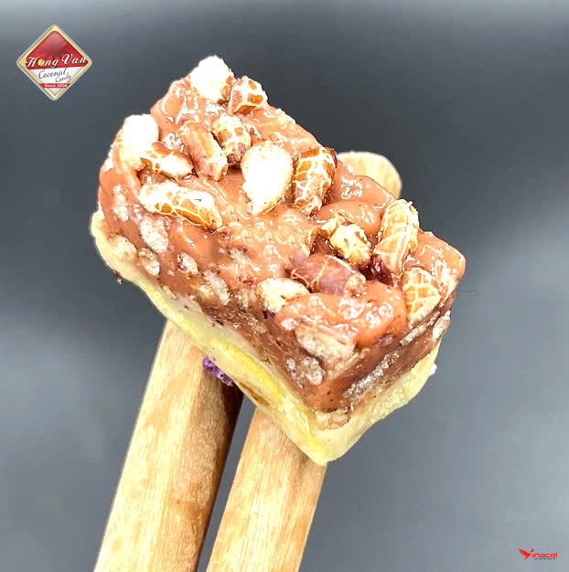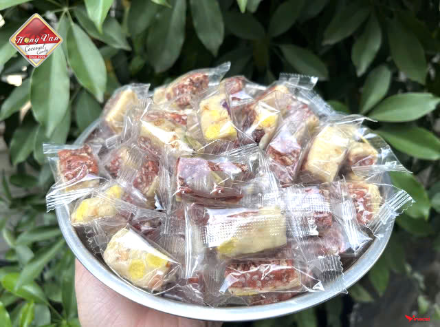 Để kéo dài tuổi thọ và đa dạng hóa các mặt hàng sản phẩm, thương hiệu Hồng Vân đã nghiên cứu cho ra nhiều loại kẹo dừa với hương vị khác nhau, trong ảnh là loại kẹo biến tấu từ dừa non.