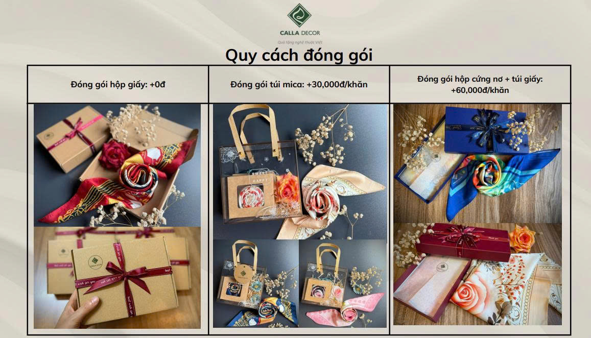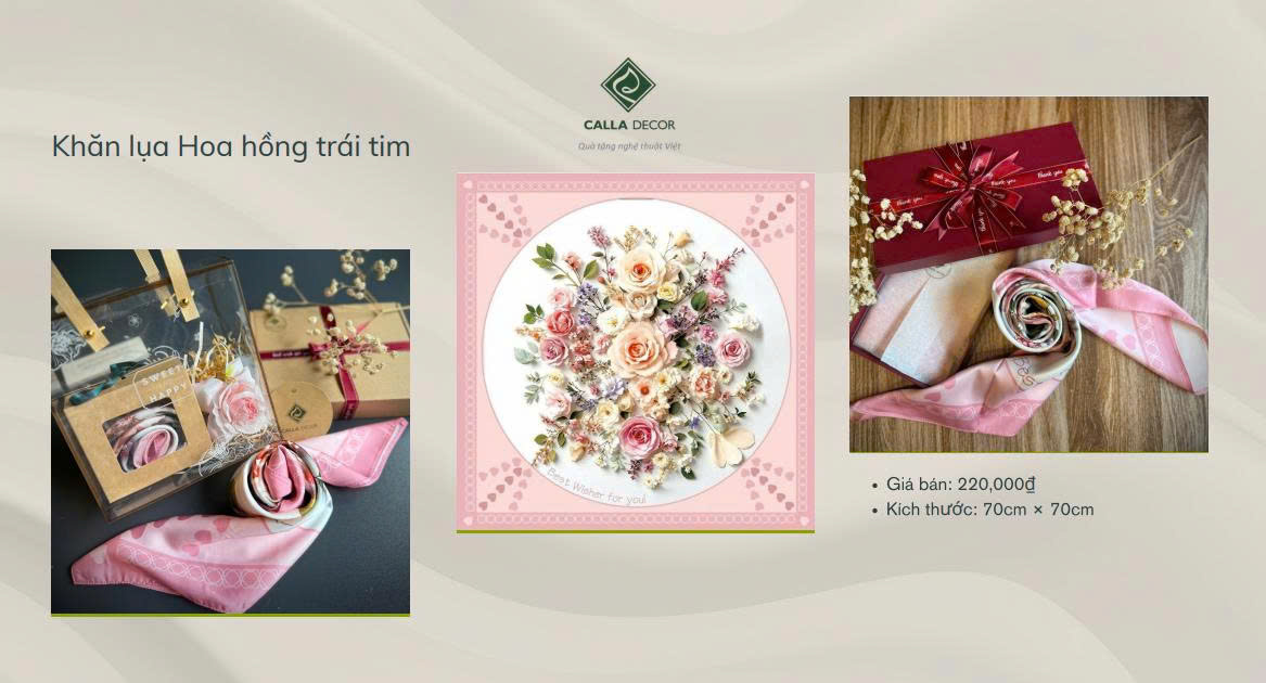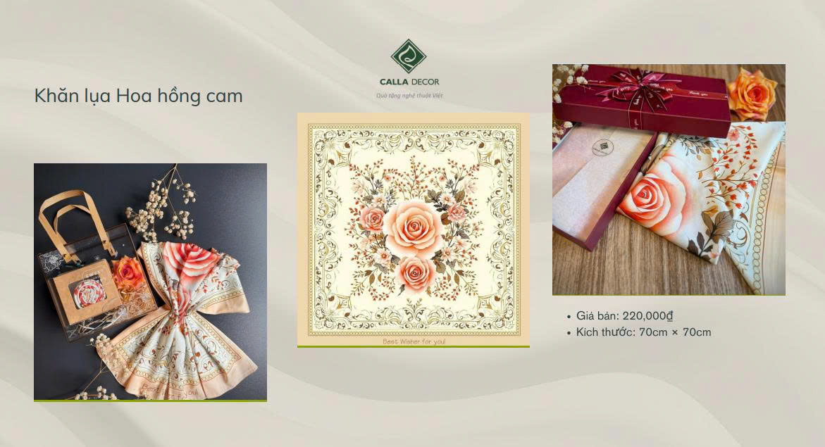 Phù hợp làm quà tặng: Khăn lụa Calla Decor thường được chuẩn bị trong hộp quà cao cấp kèm thiệp chúc mừng, là một món quà tinh tế và chu đáo cho người thân, bạn bè.