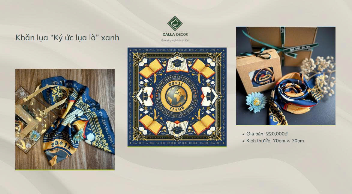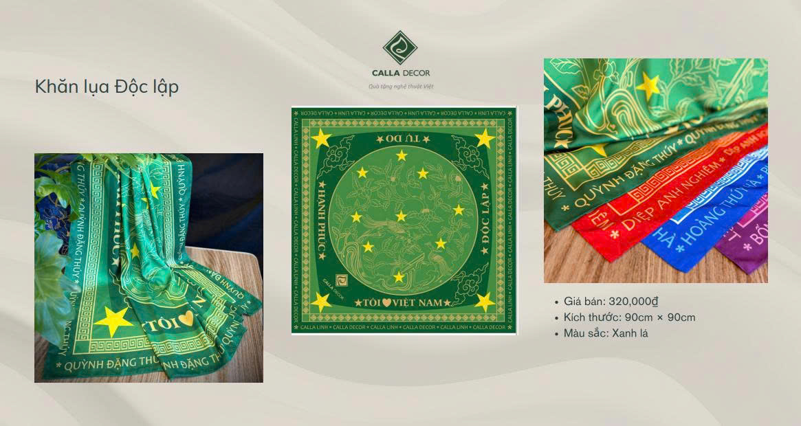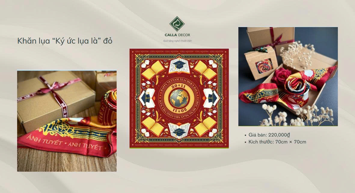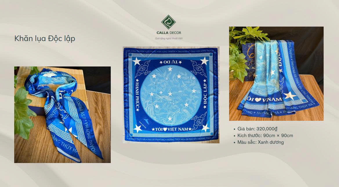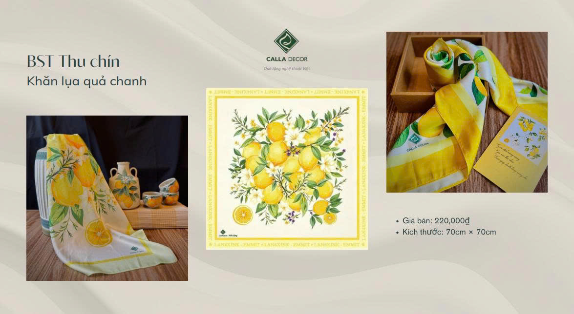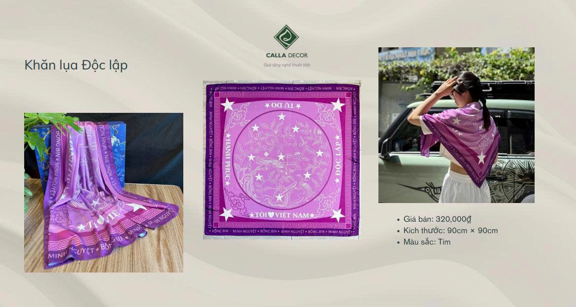 Triết lý "Vẻ đẹp truyền thống – chạm đến trái tim" dẫn lối Calla tạo ra những món quà không phô trương mà đầy chiều sâu, không cầu kỳ mà vĩnh cửu. Khăn lụa Calla Decor không chỉ là món quà trao tay trong những dịp đặc thù, mà còn là vật phẩm hữu dụng trong đời sống hàng ngày, mang theo tình cảm chân thành và niềm tự hào dân tộc.