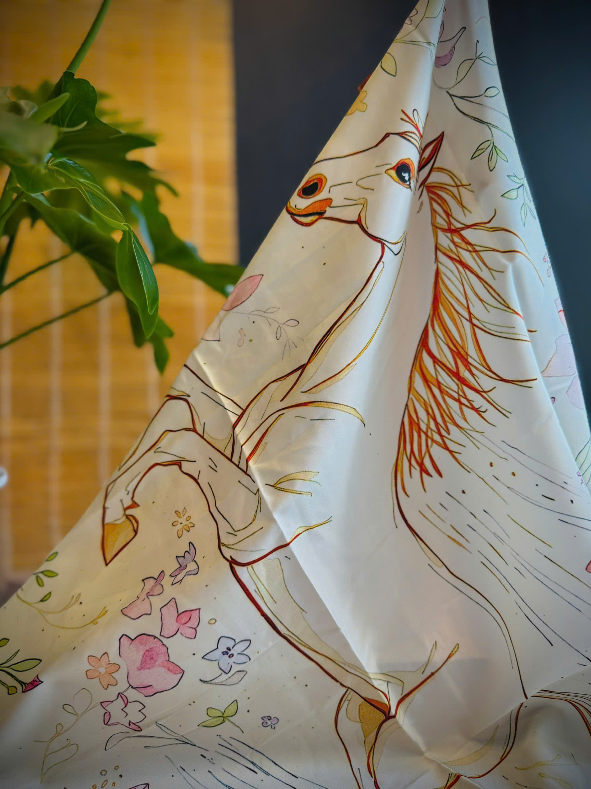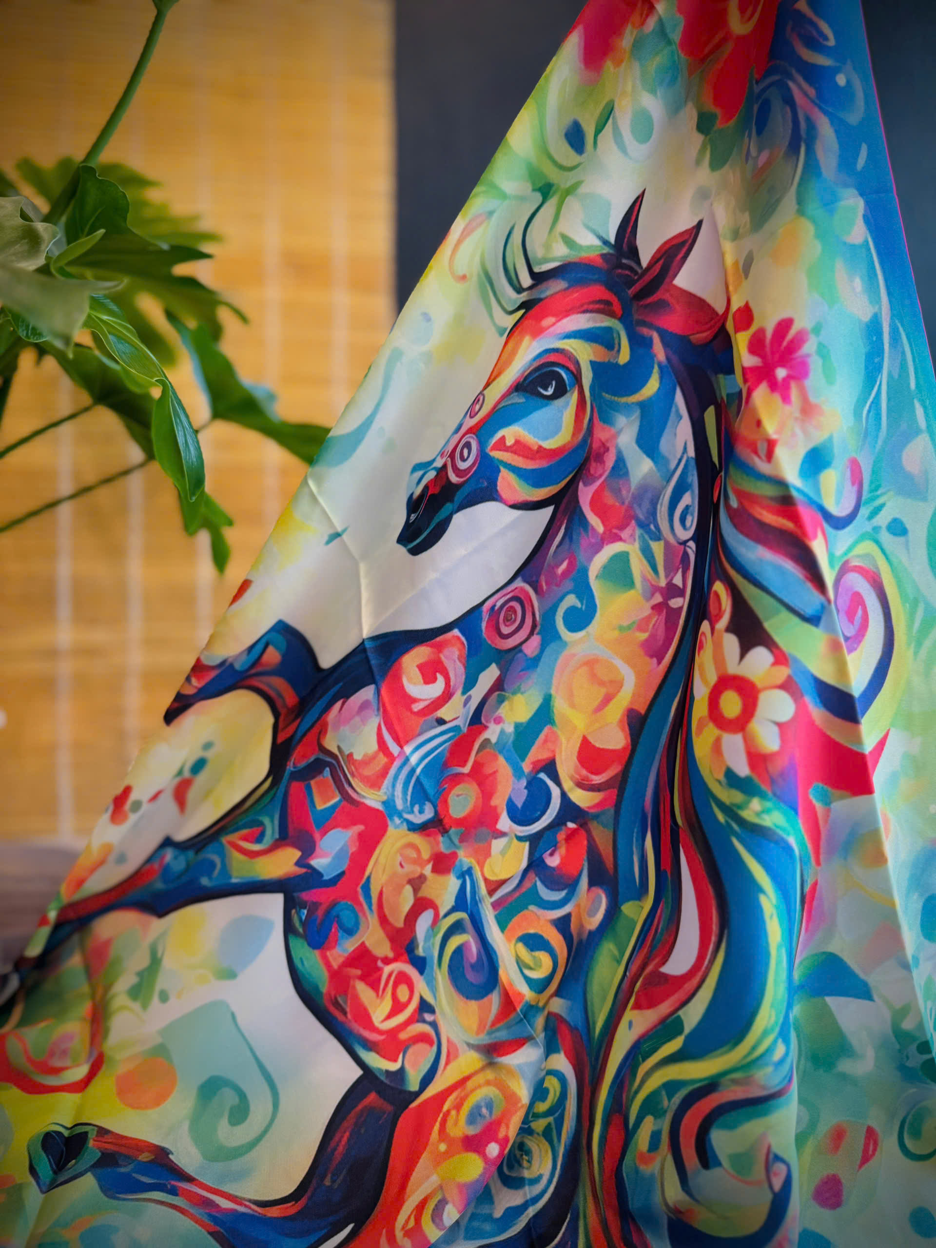 Khăn lụa Mã đáo (viền xanh/đỏ): Họa tiết ngựa mang ý nghĩa may mắn.