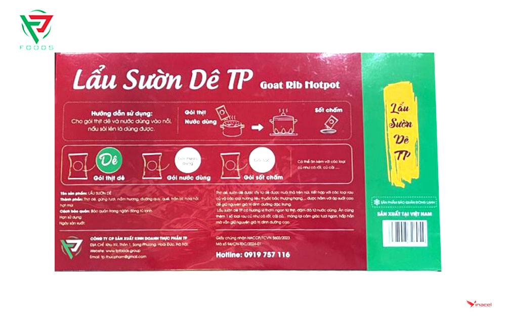 • Lẩu sườn dê TP được đóng gói tiện dụng với 1 gói thịt sườn dê hầm 450gr, 1 gói lòng xách chần 250gr, 1 gói cốt lẩu, 1 gói sốt tương chấm, rau củ quả và mì tôm, giúp bạn dễ dàng chế biến và thưởng thức.
