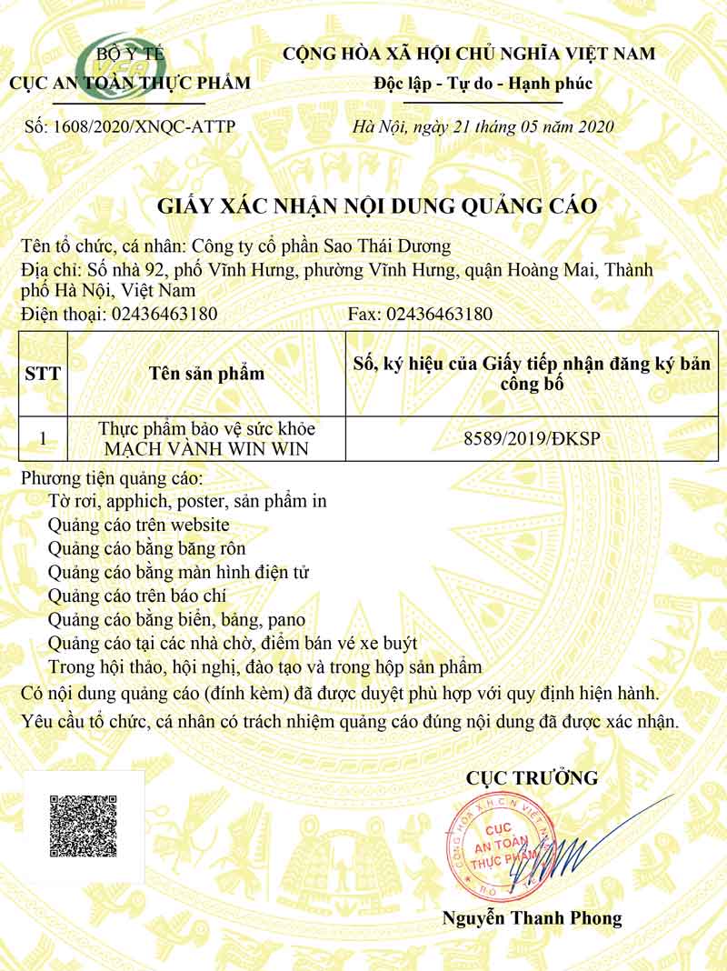 Viên uống Mạch Vành Win Win Sao Thái Dương có đăng ký đầy đủ thông tin tại Cục an toàn thực phẩm – Bộ Y tế, đảm bảo nguồn gốc sản phẩm rõ ràng để khách hàng yên tâm lựa chọn.