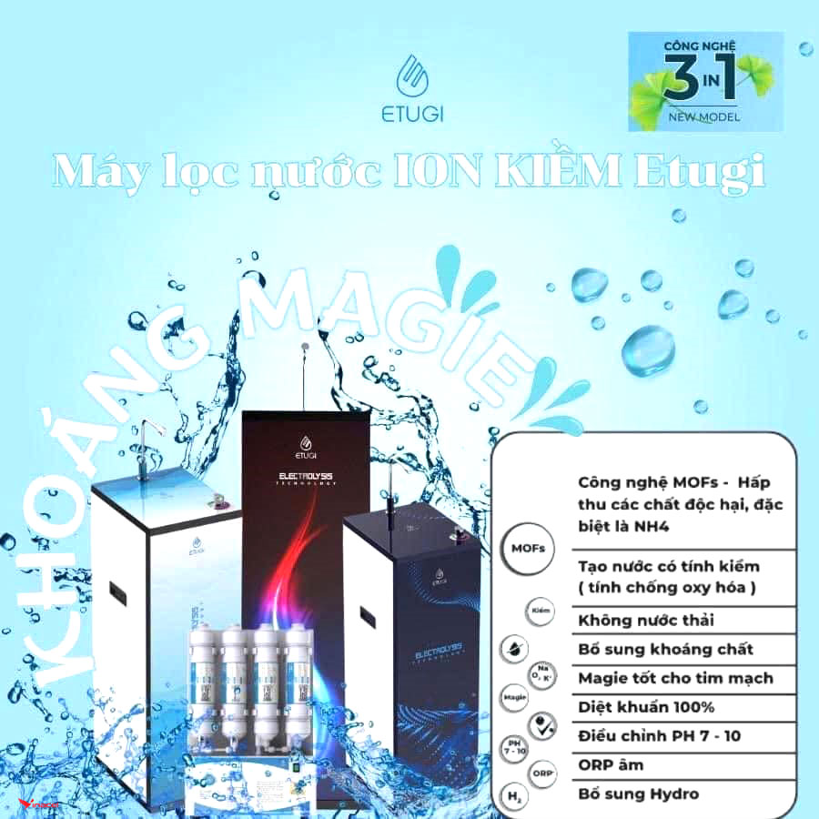 • Tạo nước có khoáng magie tốt cho tim mạch: Magie là khoáng chất thiết yếu đóng vai trò quan trọng trong nhiều chức năng của cơ thể. Tuy nhiên, chế độ ăn uống hiện đại thường thiếu hụt Magie, dẫn đến nhiều vấn đề sức khỏe. Nước ion kiềm ETUGI được bổ sung Magie tự nhiên, giúp cơ thể: Giúp xương chắc khỏe, hỗ trợ hệ thần kinh và tim mạch. Giảm căng thẳng, mệt mỏi, cải thiện chất lượng giấc ngủ. Tăng cường chức năng cơ bắp, hỗ trợ quá trình trao đổi chất.