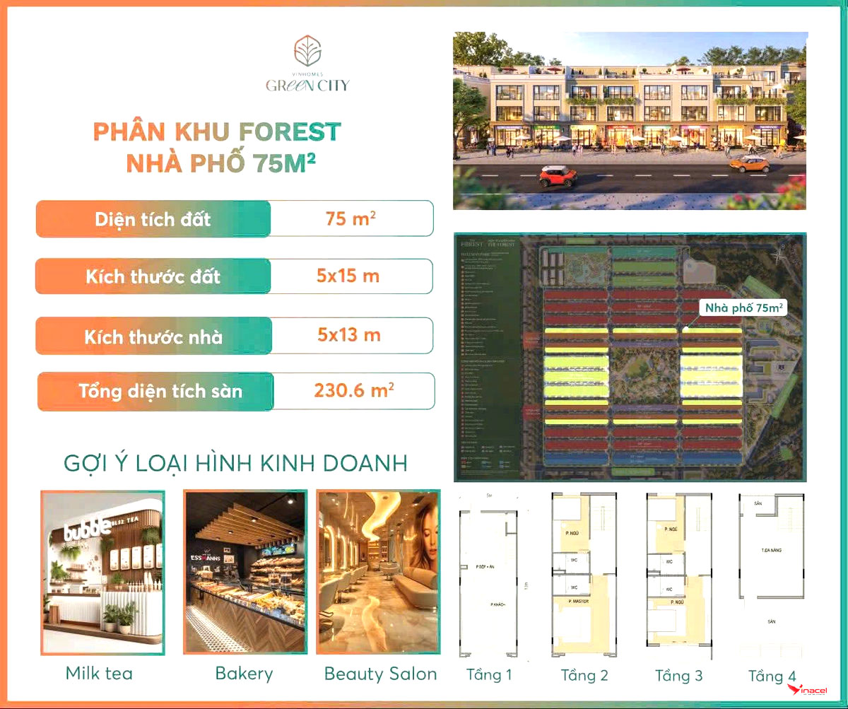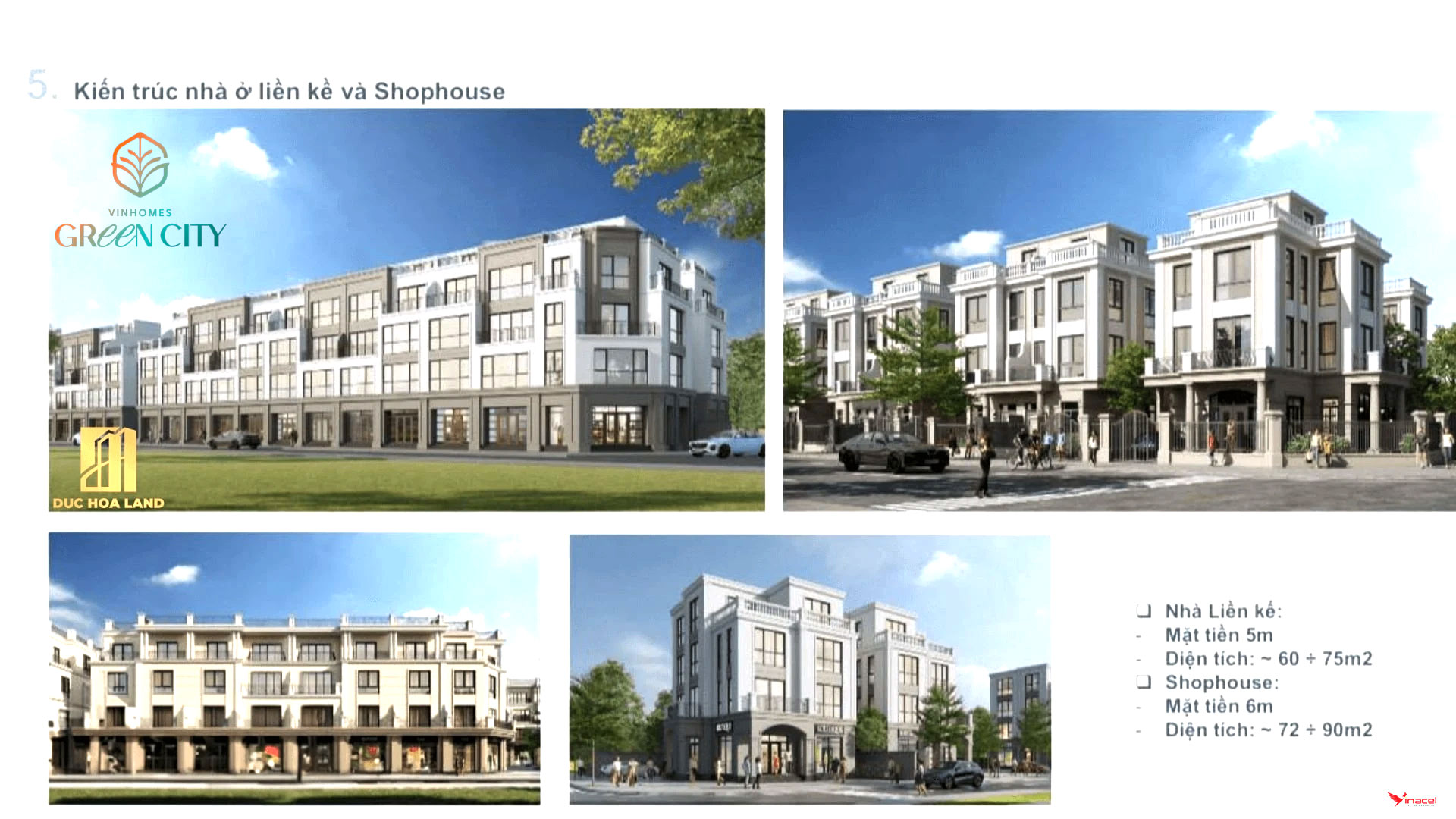 Các dãy nhà cao 5 tầng, diện tích trung bình từ 60 – 90 m²/căn, thiết kế theo phong cách hiện đại. Những căn liền kề mặt đường chính có diện tích lớn hơn (75 – 100 m²) với tầng 1 linh hoạt sử dụng cho mục đích kinh doanh thương mại.