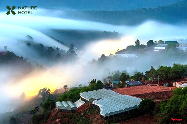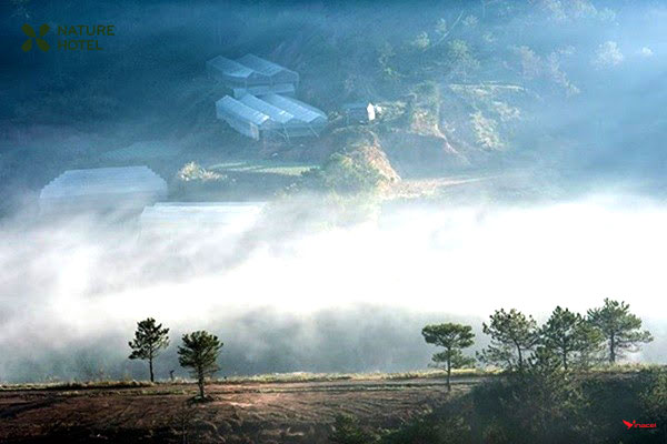 Trong khi ấy, ở những ngọn đồi cao thì những hàng thông vẫn chìm trong màn sương mờ ảo. Phía ngoại ô, nắng lấp lánh trên những khu nhà lồng trồng hoa, xuyên qua lớp sương sớm chiếu rọi xuống những thửa ruộng bậc thang đang trong mùa sai quả. Thiên nhiên hùng vĩ mà giản dị đậm chất thôn quê, rời xa phố thị, tận hưởng một buổi sớm trong lành giữa núi rừng và biển mây huyền ảo, đó sẽ là trải nghiệm khó quên về thành phố cao nguyên.