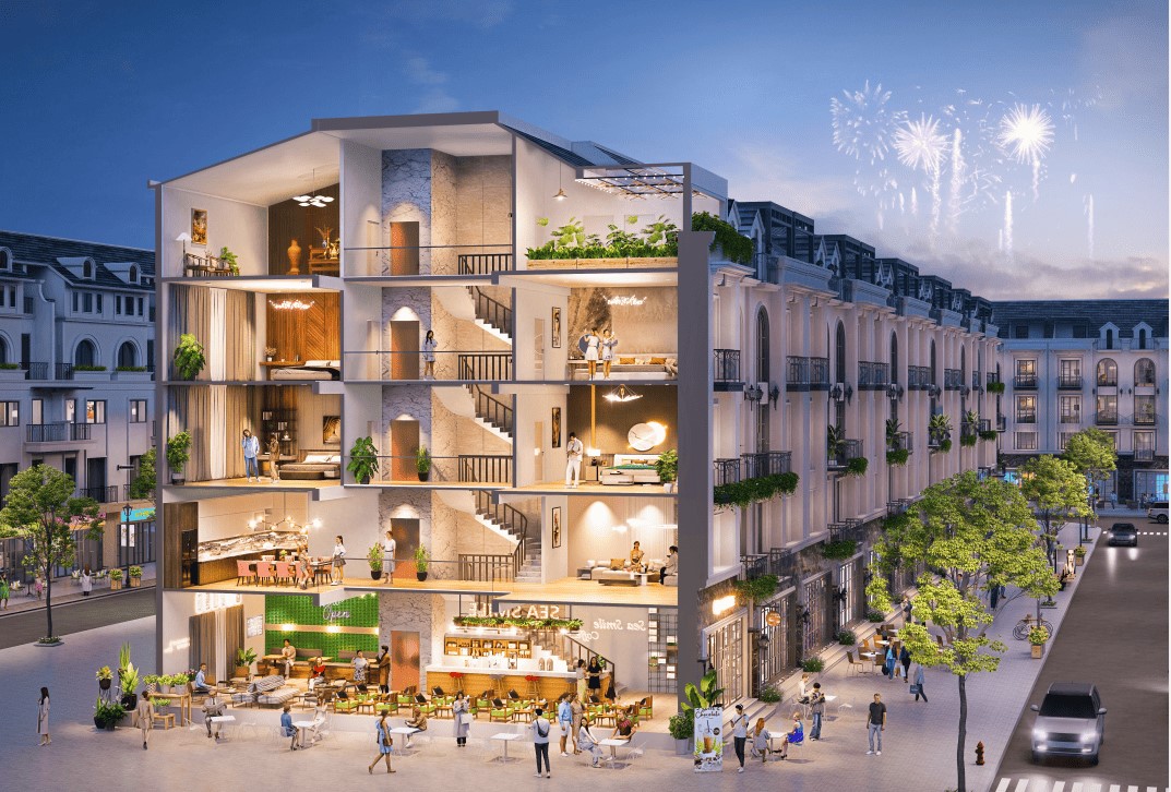 Mô hình "2 trong 1": Shophouse kết hợp hài hòa giữa không gian sống tiện nghi ở các tầng trên và mặt bằng kinh doanh ở tầng trệt, tối ưu hóa mục đích sử dụng.