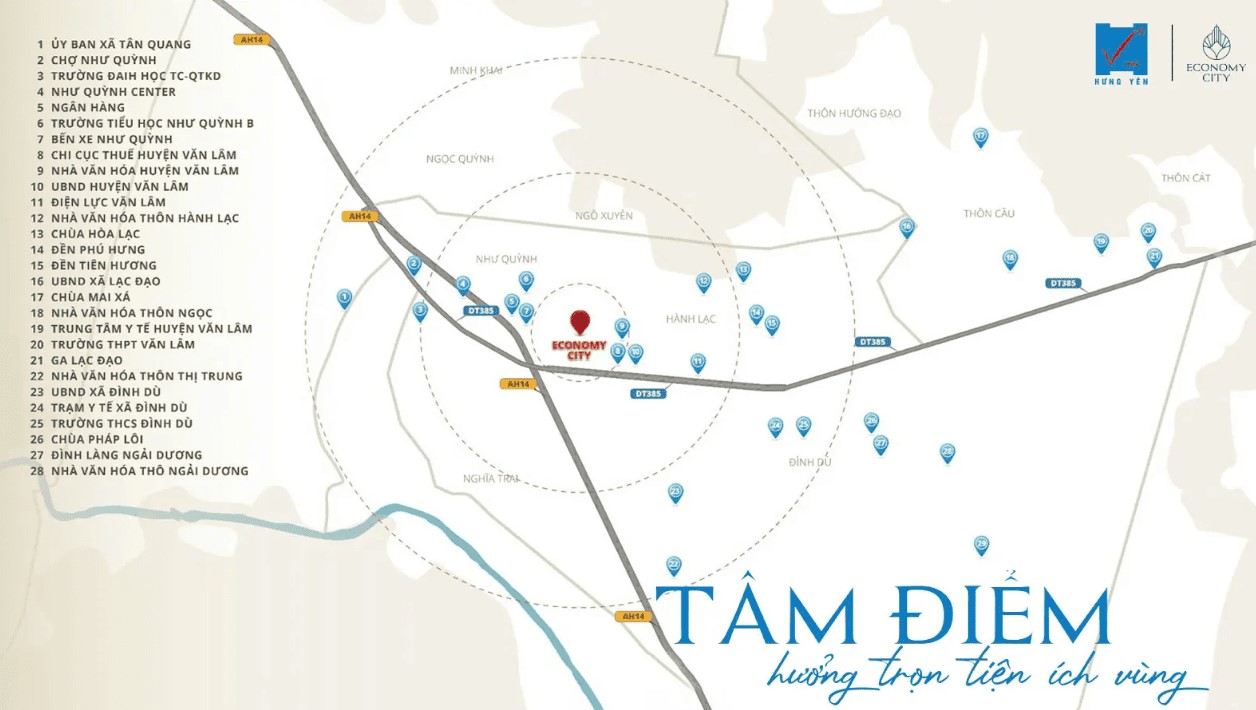 - Trung tâm kinh tế tài chính: Economy City Hưng Yên là KĐT Quy mô lên tới 36ha là đô thị trung tâm và lớn nhất của huyện Văn Lâm tỉnh Hưng Yên.