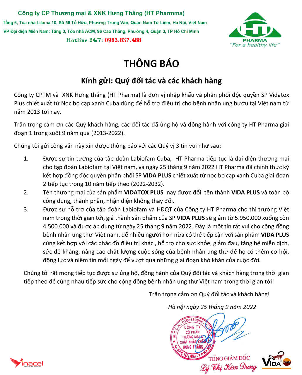 Bằng sự nỗ lực Công ty HT Pharma đã đưa được sản phẩm về Việt Nam từ 2014 để đồng hành cùng bệnh nhân U Bướu vượt qua bệnh tật. Và cũng từ hôm nay, sản phẩm Vida Plus chiết xuất từ Nọc bọ xanh Cuba đã có tên thương mại mới là Vida Plus giúp hỗ trợ tăng cường sức đề kháng và hỗ trợ cải thiện thể trạng cho bệnh nhân u bướu (Bệnh nhân u bướu thường có thể trạng kiệt sức, mệt mỏi, đau đớn, mất ăn mất ngủ và luôn thiếu năng lượng do sự phát triển của khối u).