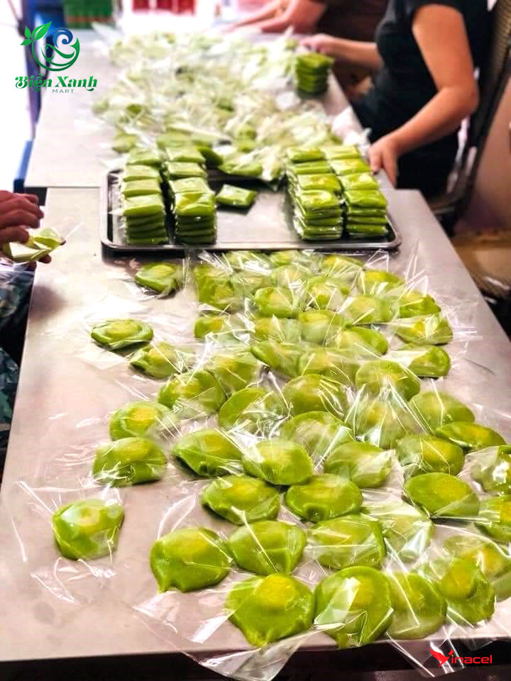 Nhân bánh được chia thành từng viên, rồi dùng thứ cốm đã nấu bọc ngoài. Sau đó bọc ni long bên ngoài để bảo quản.
