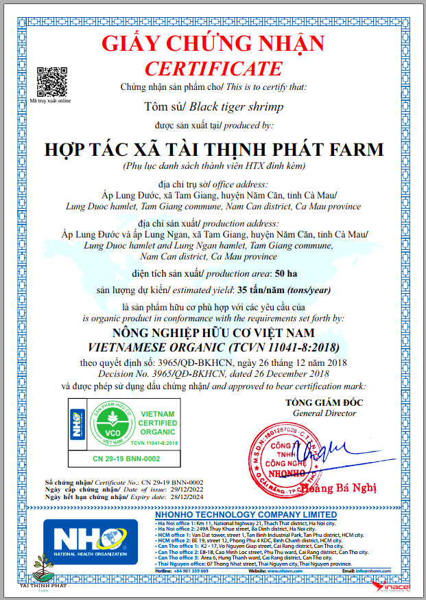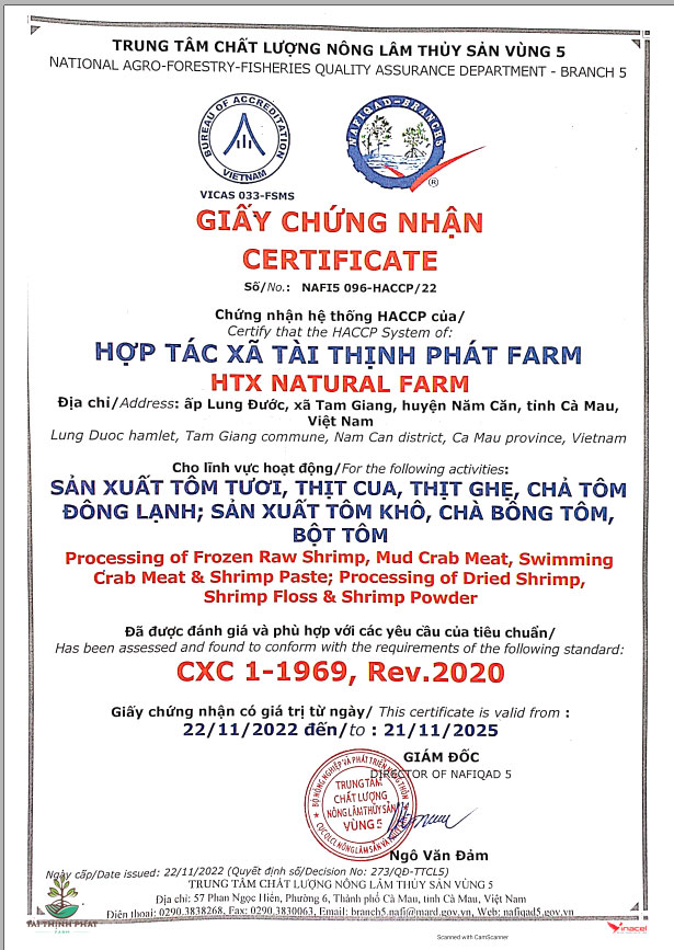 Ngoài ra, HTX còn được cấp giấy chứng nhận HACCP và có chứng nhận hữu cơ cho sản phẩm tôm sú với diện tích 50 ha. Từ đó, thương hiệu và sản phẩm chế biến từ sản vật bản địa của vùng đất Năm Căn, Cà Mau dần có chỗ đứng ở các cửa hàng, siêu thị lớn ở nhiều tỉnh, thành phố và xuất khẩu.
