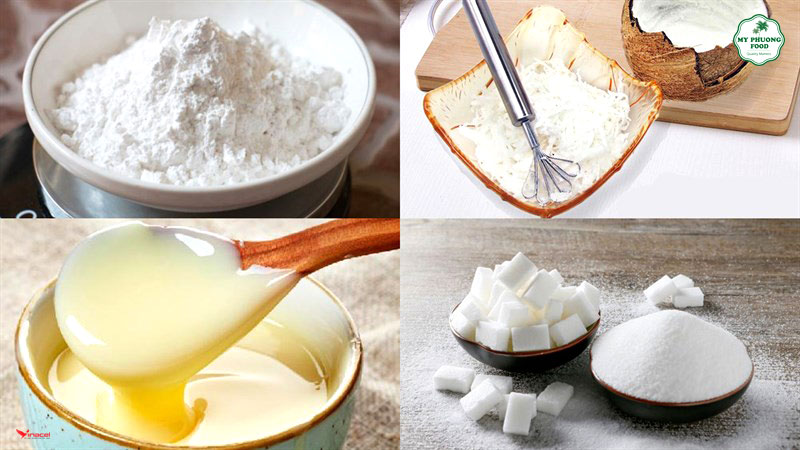 • Cho vào tô 200gr dừa nạo, 50gr đường, 60gr bột gạo nếp, 20gr sữa đặc, 1 muỗng cà phê tinh chất vani.