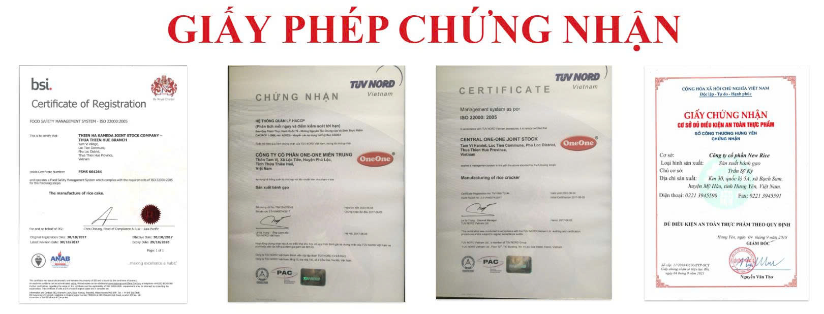 Đặc biệt, bánh gạo One One còn vinh dự được nhận giấy chứng nhận vệ sinh an toàn thực phẩm ISO 22000 : 2005 cấp bởi BSI. Không chỉ được yêu thích tại Việt Nam, sản phẩm này đã được xuất khẩu và có mặt tại các thị trường lớn trên thế giới như Hàn Quốc, Trung Quốc, New Zealand, Đài Loan, Singapore, Mỹ, Macau,...