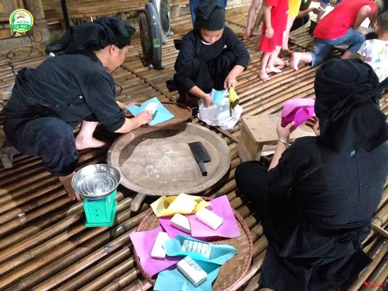 Sau khi các nguyên liệu đã sẵn sàng, người làm bánh phải “hạ thổ” bột bánh để đảm bảo bánh mềm ngon, không dính miệng. Quá trình “hạ thổ” là đổ bột trên khung gỗ. Phía dưới khung gỗ là cát. Bên trên lót nhiều lớp lưới rồi mới đến lớp vải và lớp bột “hạ thổ”. Việc hạ thổ làm cho bột bánh ỉu và tăng tính liên kết. Đến đây, người thợ trộn bột đã “hạ thổ” với đường, dùng con lăn để bột và đường quyện đều vào nhau và tăng độ nhuyễn. Sau đó, bột được nén vào khuôn. Nén bánh vào khuôn là công đoạn đòi hỏi sự khéo léo của người làm bánh, nếu nén mạnh tay quá bánh sẽ cứng, còn nhẹ quá bánh lại dễ bị bở, vỡ vụn, không thành miếng. Sau khi bột ép vào khuôn phải tiến hành cắt bánh ngay. Nếu bột để lâu sẽ khô, khó cắt. Cuối cùng, bánh được gỡ ra khỏi khuôn và dùng giấy trắng hoặc giấy màu để gói bánh.