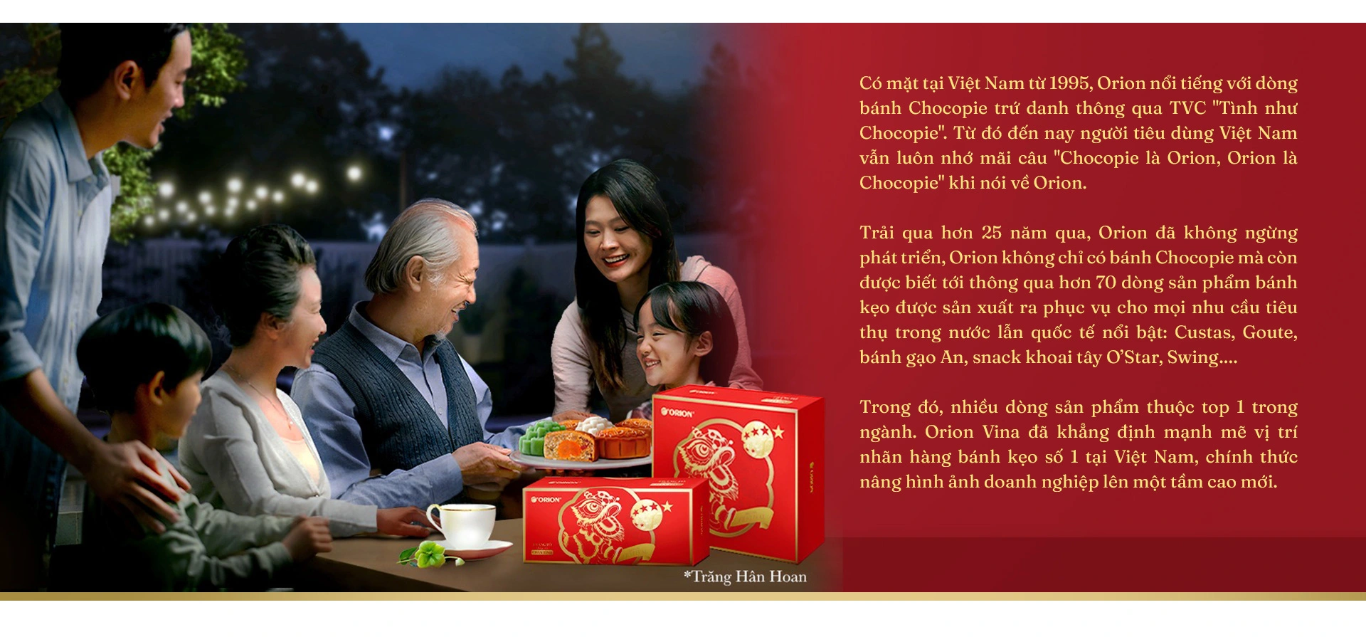 Có mặt tại Việt Nam từ 1995, Orion nổi tiếng với dòng bánh Chocopie trứ danh thông qua TVC ‘Tình như Chocopie”. Từ đó đến nay người tiêu dùng Việt Nam vẫn luôn nhớ mãi câu ‘Chocopie là Orion, Orion là Chocopie” khi nói về Orion.