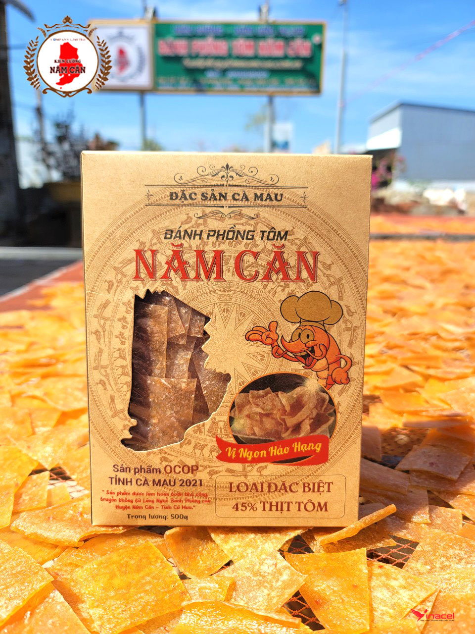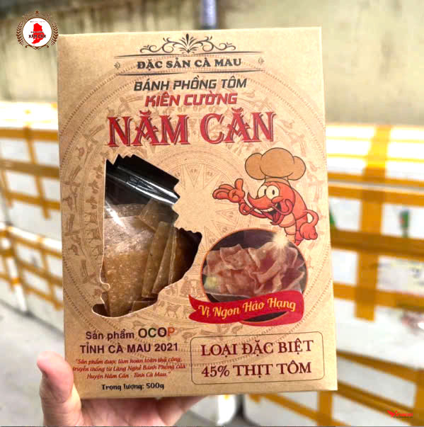 Bánh phồng tôm Năm Căn được gọi theo tên thị trấn Năm Căn tỉnh Cà Mau. Sản phẩm được làm hoàn toàn thủ công, truyền thống từ làng nghề Bánh Phồng của huyện Năm Căn tỉnh Cà Mau. Với thành phần được làm từ tôm tươi đem đến hương vị thơm ngon đậm đà. Đặc trưng của làng nghề truyền thống lâu đời Năm Căn.