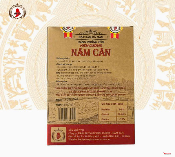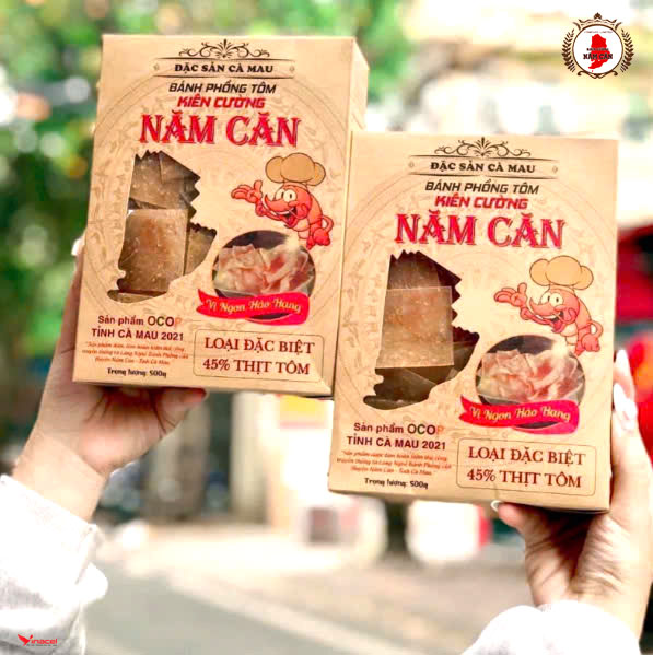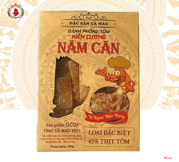 Bánh Phồng Tôm Kiên Cường Năm Căn – đặc sản Cà Mau Nhắc đến bánh phồng Năm Căn là nhắc tới cơ sở chế biến Kiên Cường đã từ lâu nổi tiếng của Đất Mũi Cà Mau. Sản phẩm được làm hoàn toàn thủ công, từ làng nghề bánh phồng của huyện Năm Căn có vị giòn, ngon hảo hạng, dễ chế biến, giòn, thơm, dùng ăn như snack hoặc ăn kèm với các món khác (như gỏi) Đây là loại đặc biệt với thành phần thịt tôm 45%.