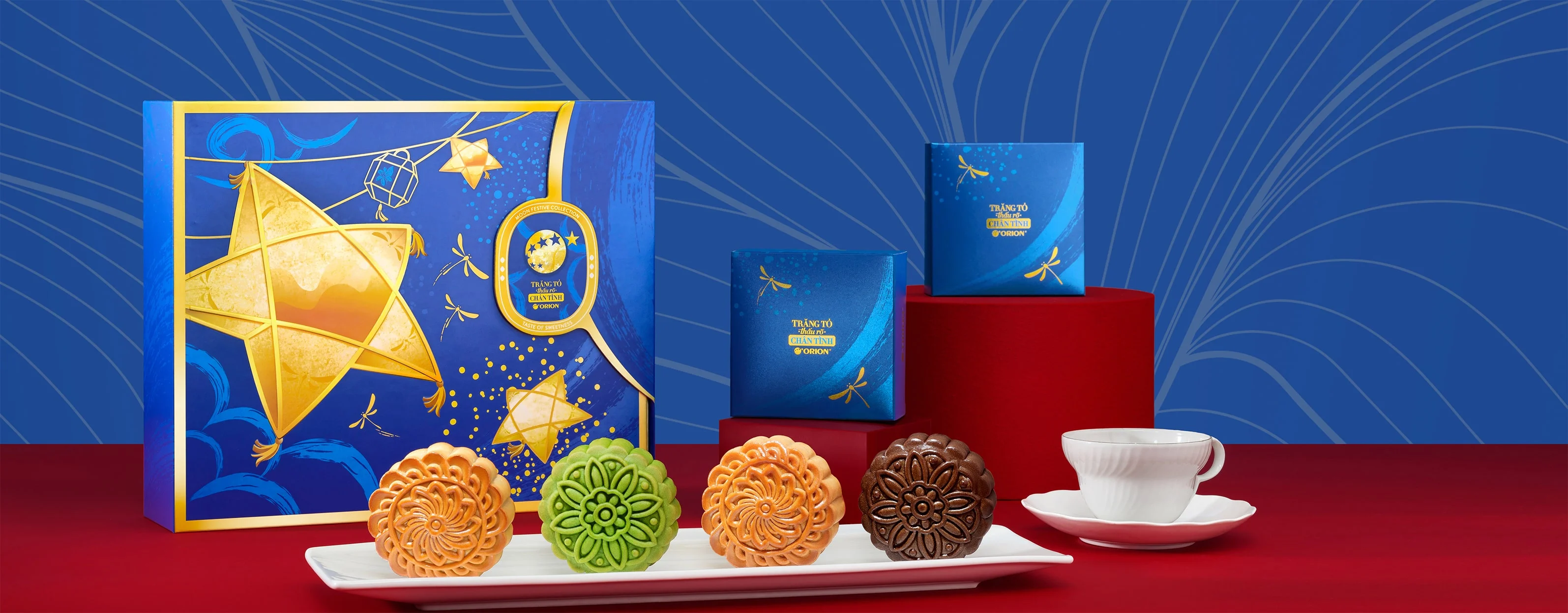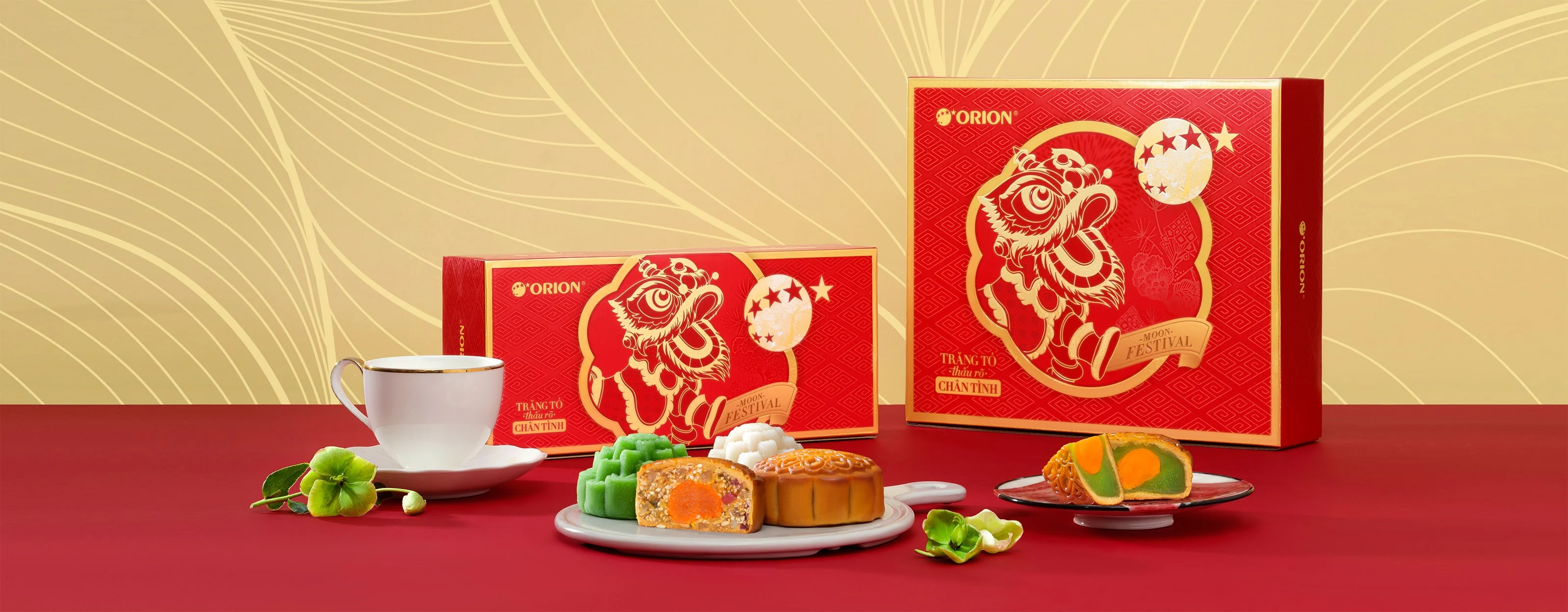 Năm 2023 chúng tôi ra mắt 4 bộ sản phẩm quà tặng: Trăng Hân Hoan, Trăng Chân Tình, Trăng Tâm Giao, Trăng Tinh Hoa. Mỗi bộ sản phẩm mang một màu sắc riêng, chứa đựng nét nghệ thuật ẩm thực tinh hoa từ bàn tay nghệ nhân tài hoa. Xét về thiết kế bao bì, bánh Trung Thu Orion Mang vẻ đẹp của truyền thống nhưng không kém phần hiện đại. Vẫn đâu đó là hình ảnh của những ký ức xưa hòa quyện cùng với nét đẹp nghệ thuật tạo nên một bản hòa ca rạng rỡ.