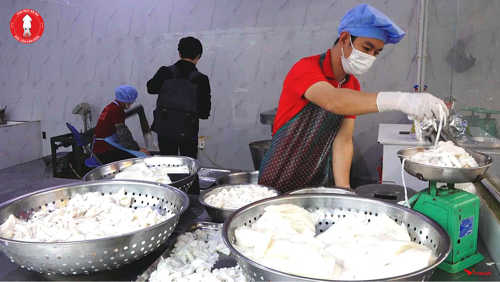 Một trong những điểm khác biệt, quyết định chất lượng sản phẩm của cơ sở chính là quy trình chế biến kỹ lưỡng. Mực được lột bỏ da, râu, mai, làm sạch ruột và rửa sạch rồi đưa đi cấp đông đủ 20 ngày mới đưa ra chế biến. Thao tác này giúp khử mùi tanh và tăng độ dẻo, dai của mực. Khi chế biến, mực được đưa ra rã đông, rửa bằng nước sạch đưa đi quay li tâm để vắt thật khô mực, rồi tiếp tục được lau, thấm sạch bằng khăn khô.