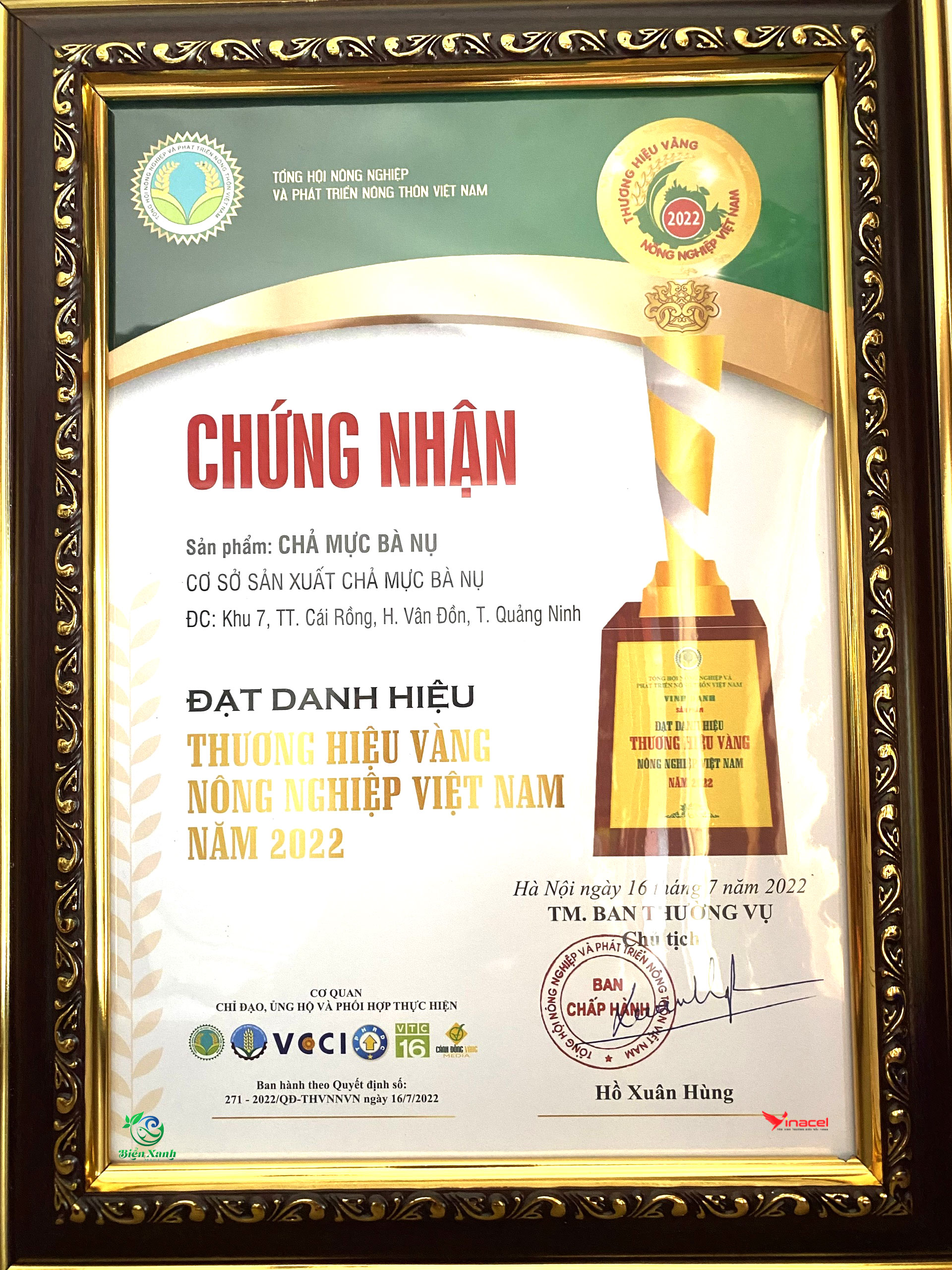 Chả mực Bà Nụ được công nhận là đặc sản địa phương của chương trình OCOP Quảng Ninh, và nhiều giải thưởng như: Di sản văn hóa ẩm thực Việt Nam 2015, Thương hiệu Việt Nam uy tín chất lượng 2016, hàng Việt Nam chất lượng cao năm 2017...