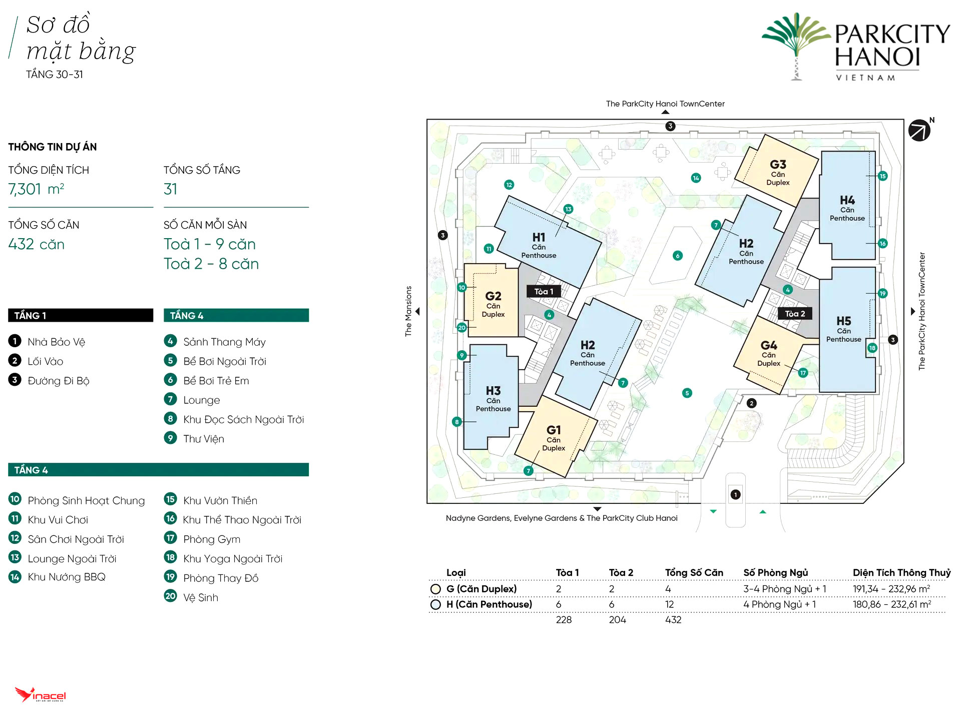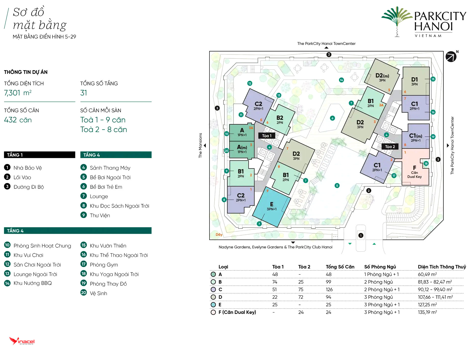 Park Kiara gồm 2 block cao 31 tầng, trong đó mỗi block sẽ gồm 1 tầng hầm, 4 tầng podium cùng 27 tầng cao với 432 căn hộ sở hữu thiết kế tinh tế, được chú trọng đến từng chi tiết nhỏ và đều có tầm nhìn đẹp ôm trọn những không gian ấn tượng nhất của KĐT ParkCity Hanoi.