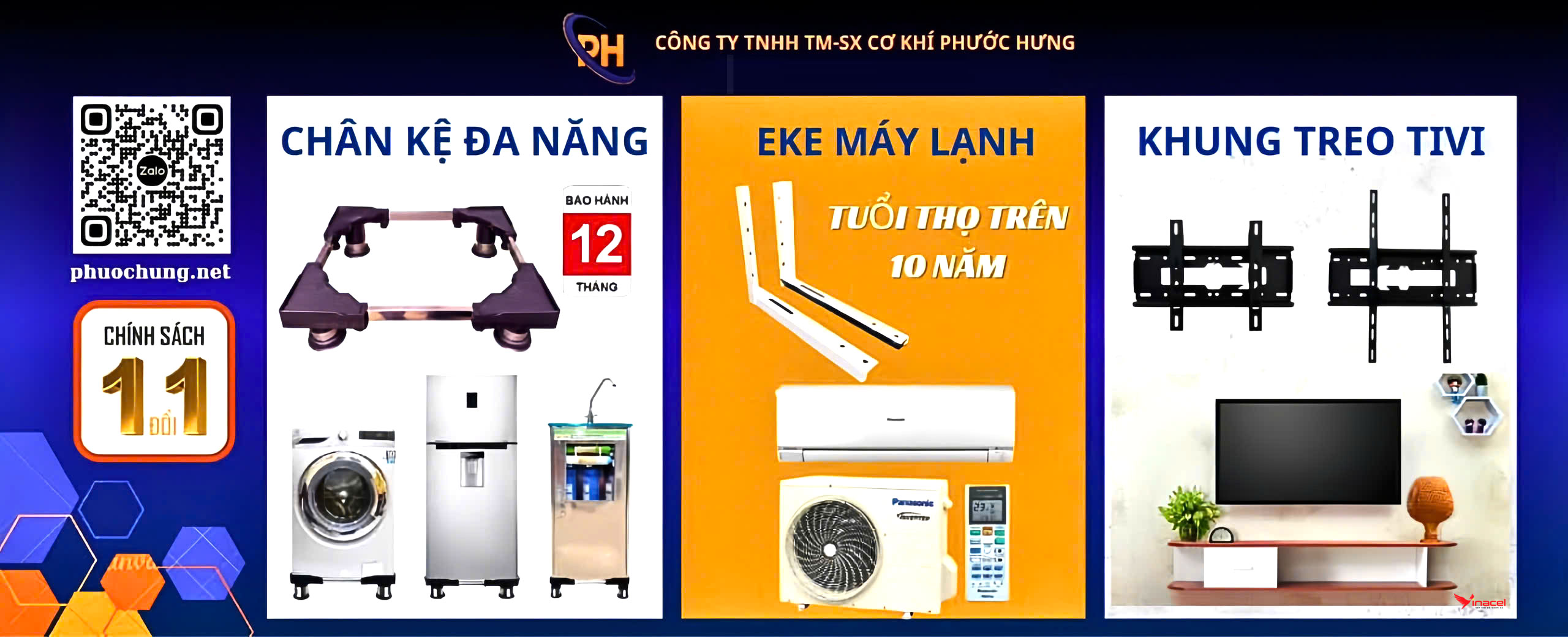 Công Ty TNHH Cơ Khí Phước Hưng Chuyên sản xuất Eke máy lạnh, Chân Kệ Đa Năng Máy Giặt - Tủ Lạnh - Máy Lọc Nước - Khung Treo Tivi. Chúng tôi Phục vụ tới khách hàng Thợ lắp ráp và Cửa hàng Vật Tư điện lạnh.