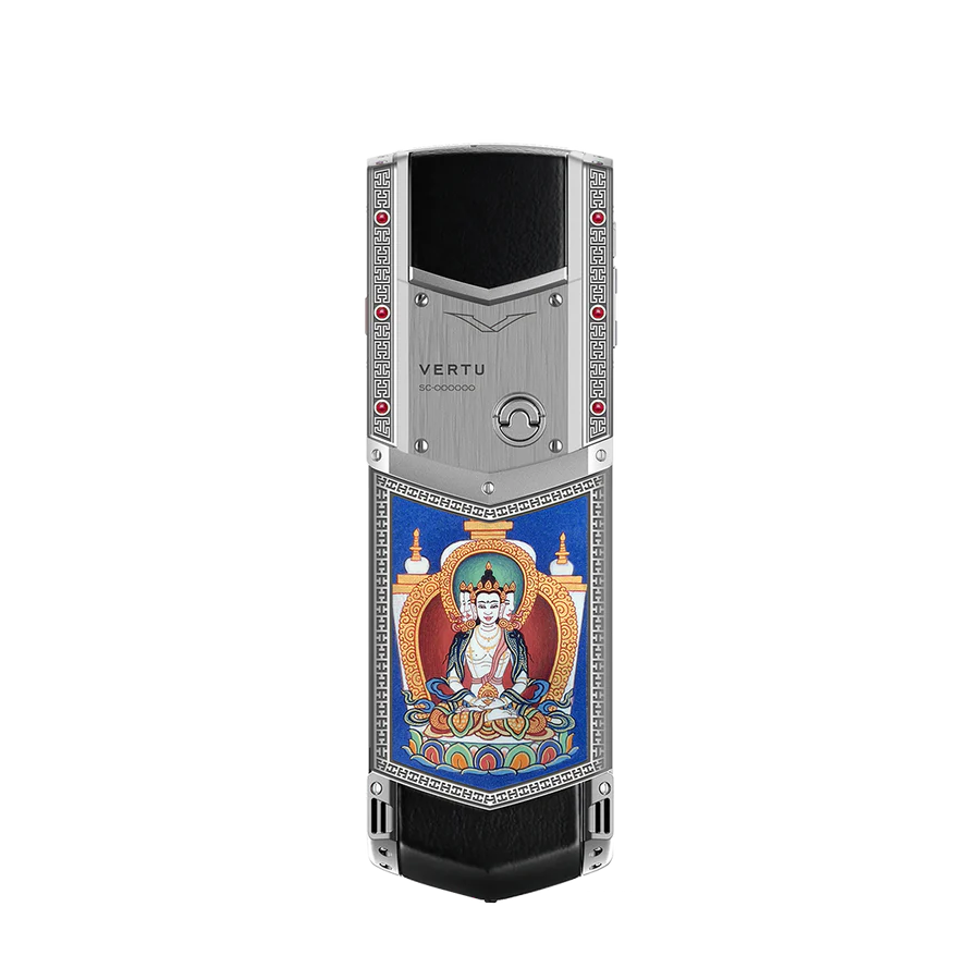 Vertu Signature V Thang-Ga VAIROCHANA nằm trong bộ sưu tập những chiếc điện thoại mang phong cách hội hoạ Tây Tạng độc đáo với thiết kế sử dụng những vật liệu quý hiếm được chọn lọc kĩ lưỡng. Nâng tầm tính thẩm mỹ tuyệt vời và tôn vinh sự khéo léo của các nghệ nhân người Anh, dòng sản phẩm này ra đời để tạo nên sự khác biệt.