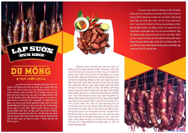 Lạp sườn là món ăn truyền thống lâu đời của người Cao Bằng, một món ăn được hòa quyện bởi mùi thơm của nắng vùng cao, mùi thoảng thơm của núi rừng, vị thơm, ngọt của thịt. Tất cả những hương vị ấy được gửi trọn trong món lạp sườn Cao Bằng khiến ai đã một lần thưởng thức đều thật khó quên. Là người con được sinh ra và lớn lên trên vùng đất Cao Bằng lịch sử, được cha ông truyền lại bí quyết làm lạp sườn, hộ kinh doanh Mông Thị Hồng có địa chỉ tại thị trấn Thanh Nhật đã lưu giữ và phát triển nghề truyền thống của quê hương. Điểm hấp dẫn của lạp sườn hun khói Du Mông xuất phát từ nguyên liệu thịt lợn, với đặc thù của vùng cao, lợn được chăn nuôi ở diện tích rộng rãi, thức ăn chủ yếu từ cám, ngô, các loại rau xanh… khiến thịt lợn rất thơm, ngon…