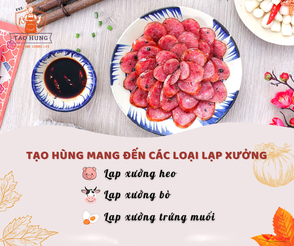 Trên 12 năm kinh nghiệm Lạp Xưởng Gia Truyền Tạo Hùng từ một cơ sở nhỏ địa phương tại Huyện Bàu Bàng dần trở thành thương hiệu được nhiều người yêu thích do hương vị đậm đà và nguồn nguyên liệu tươi ngon với 3 loại Lạp Xưởng chính là Lạp Xưởng Heo, Lạp Xưởng Bò và Lạp Xưởng Trứng Muối,… Cùng các loại sản phẩm khác.