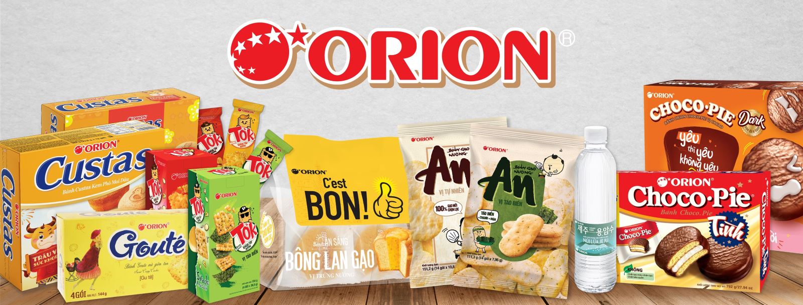 Orion được biết đến là một trong các công ty dẫn đầu thị trường bánh kẹo ở Việt Nam, với rất nhiều nhãn hàng được nhiều người biết đến như Choco.Pie, Custas, Goute hay các loại snack như O’star, Toonies, Marineboy, Swing… Với phương châm làm việc đặt chất lượng lên hàng đầu, Orion không ngừng nghiên cứu và phát triển nhiều sản phẩm mới vừa ngon miệng vừa có giá trị dinh dưỡng cao cho người tiêu dùng ở mọi lứa tuổi.