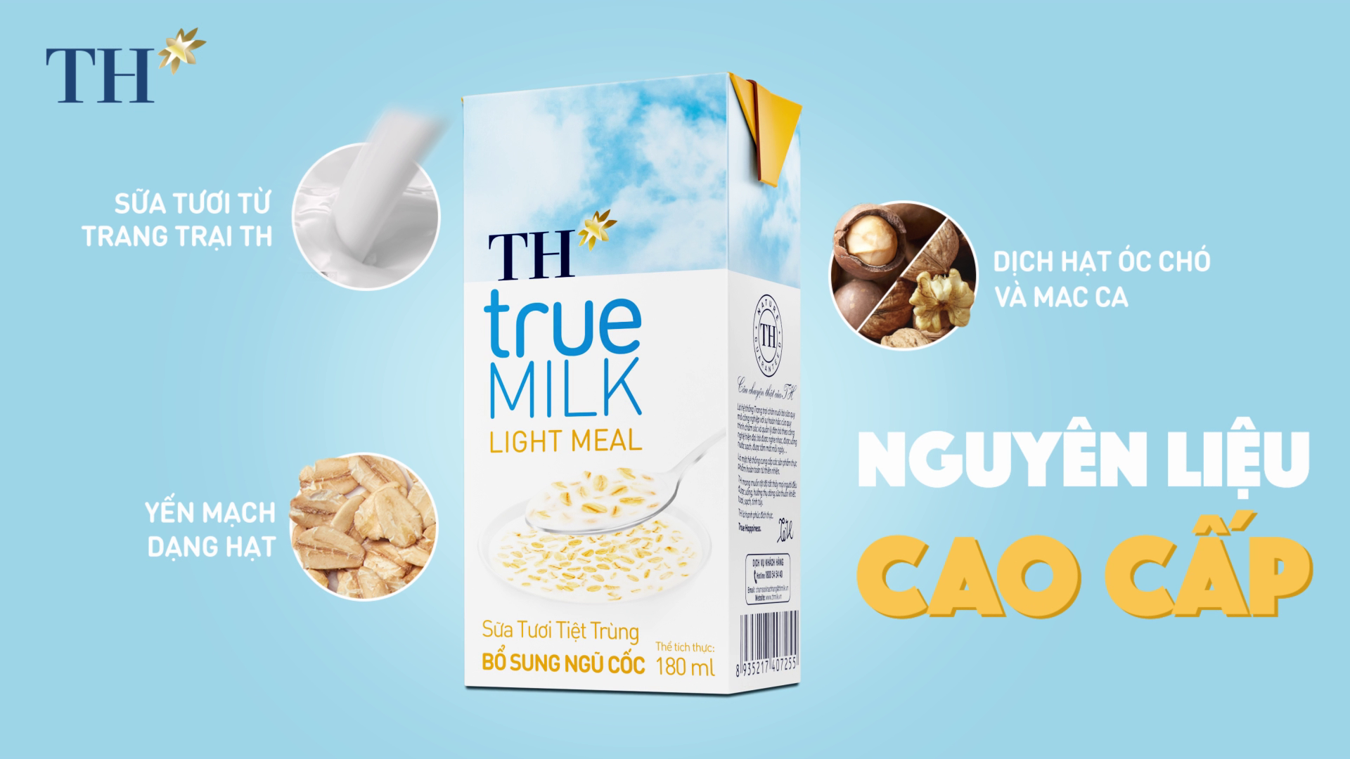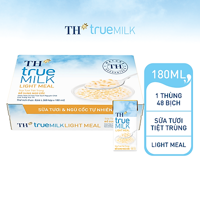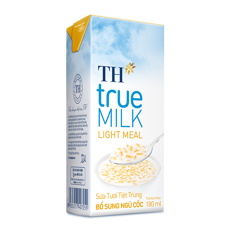 TH true MILK LIGHT MEAL là sự kết hợp hoàn hảo về mặt dinh dưỡng, với Sữa tươi sạch nguyên chất từ Trang trại TH (đạt kỷ lục “Cụm trang trại tập trung công nghệ cao với quy trình sản xuất khép kín quy mô lớn nhất thế giới”) kết hợp yến mạch nguyên cám tự nhiên, dạng hạt, nhập khẩu từ châu Âu, và dịch hạt hạt óc chó, dịch hạt mắc-ca cao cấp.